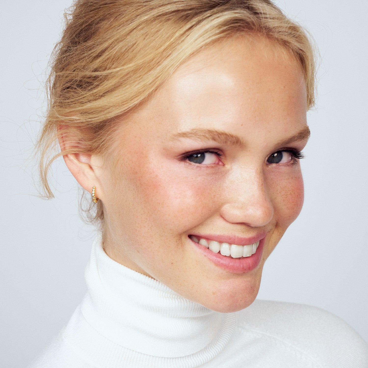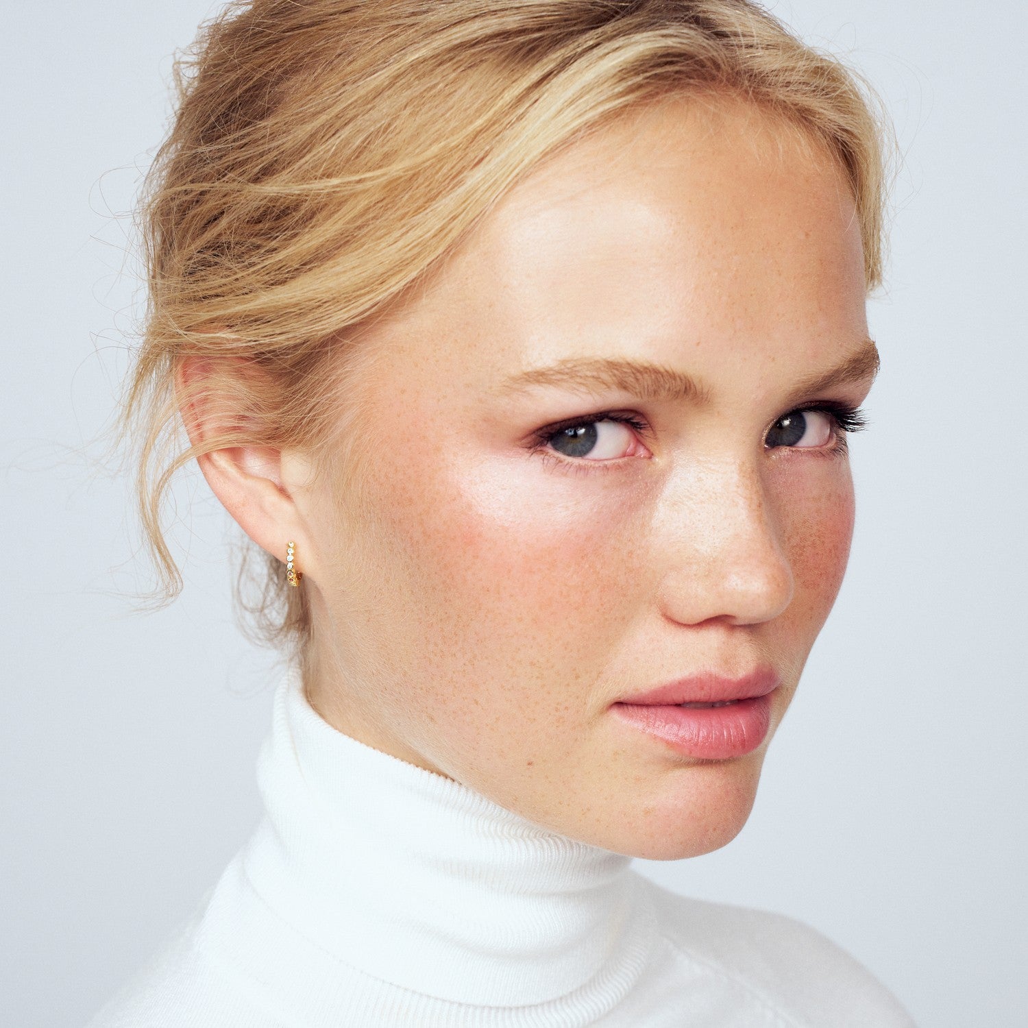 Earrings made of 18 karat gold plated 925 Sterling Silver, a polished surface, and handset with facet cut multicoloured zirconia.Earrings measurements: Inner diameter 10 mm, width 2 mm