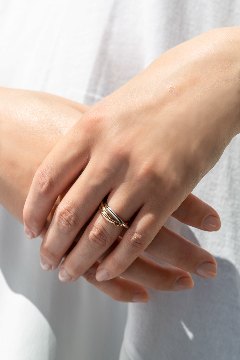 Three interlocking bands of rose, white, and yellow 9 carat gold. The three bands symbolize the past, present, and future of the couple.
