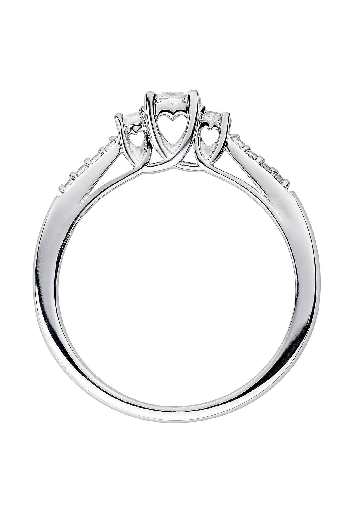 This ring is crafted from 9ct white gold, making it a chic and contemporary choice for a special occasion. Featuring a beautiful 3-stone design set with princess cut diamonds, this trilogy ring will represent your past, present and future. Finished with pavé set diamond shoulders, this engagement ring has a total diamond weight of 0.23ct, complete with heart-shaped detailing beneath the stones.