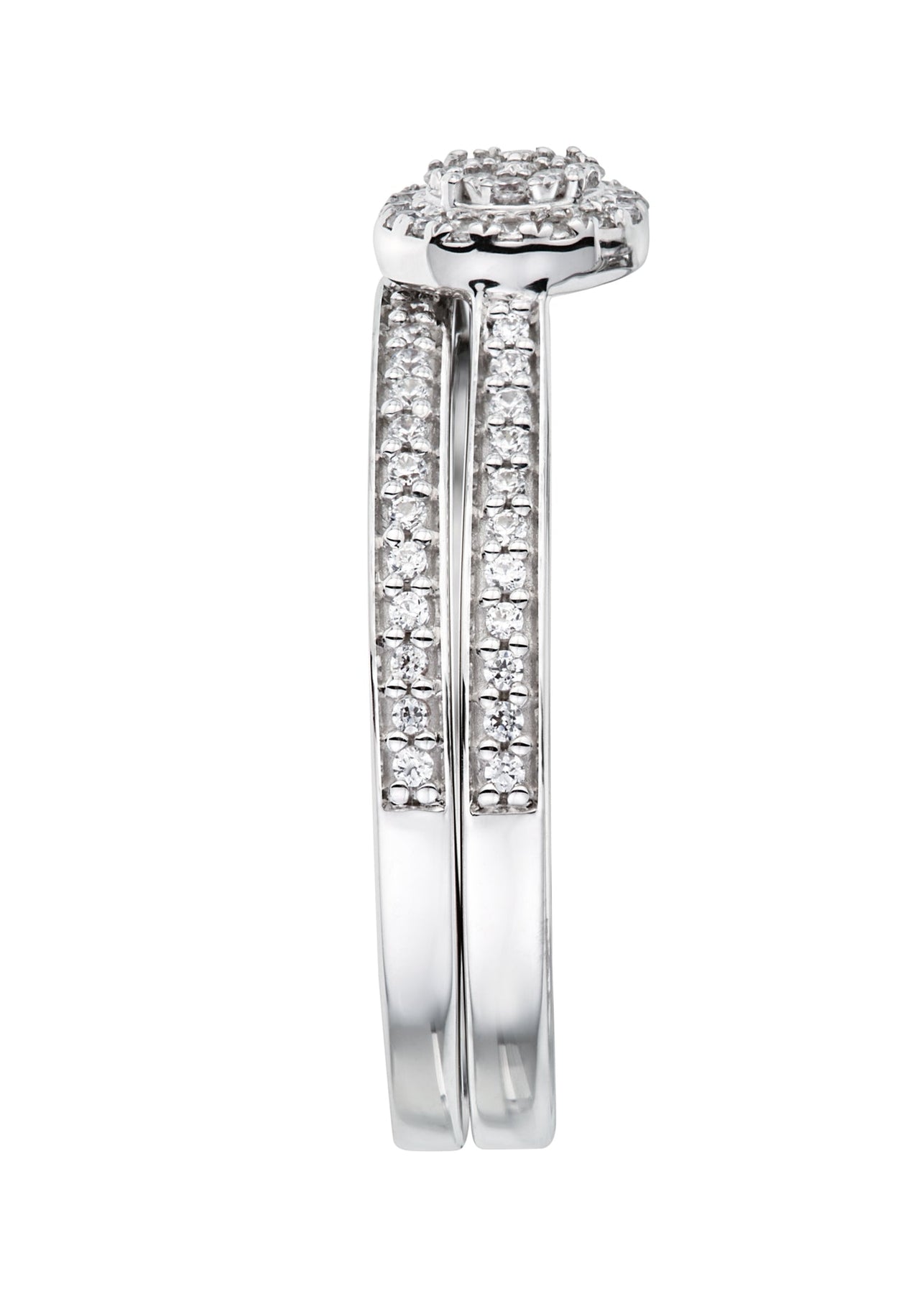 Glamorous and eye-catching, this beautiful diamond engagement ring with matching wedding band features a total of 29 points of diamond. This gorgeous bridal set has been created to fit together on your finger with comfort and exquisite style.