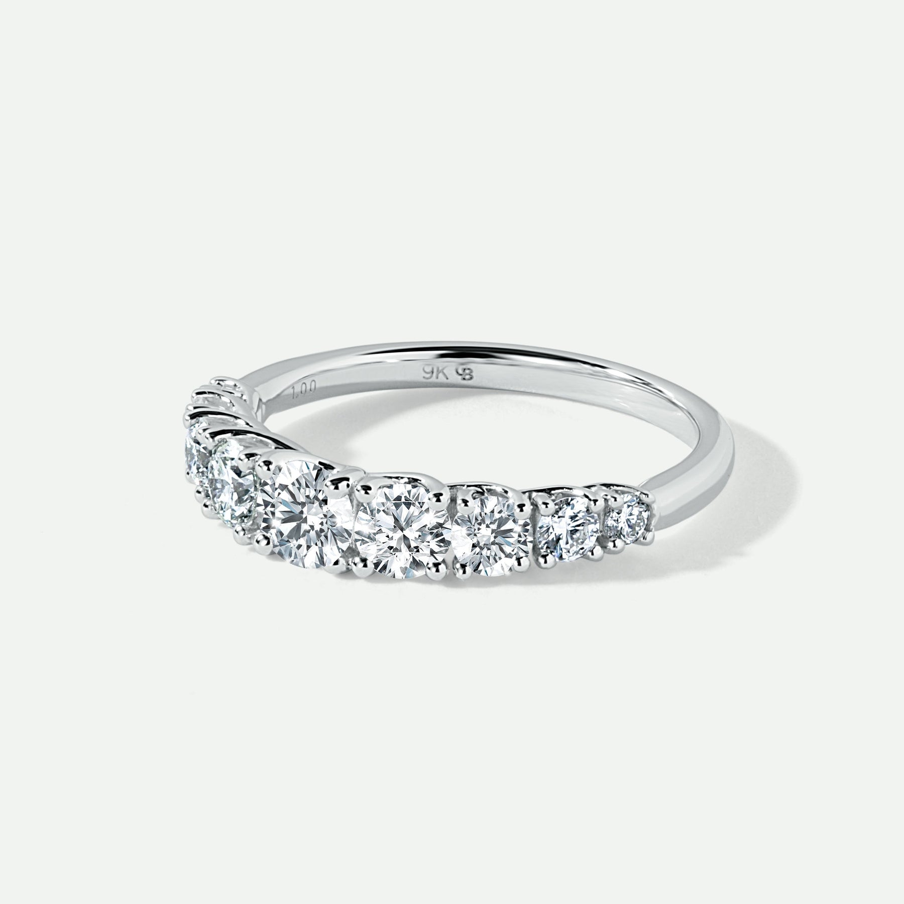 Our Amelie ring is wonderfully crafted in 9 carat solid white gold and embellished with 9 brilliant lab grown diamonds with a total of 1 carat diamonds. This lovely piece can be worn alone or as a matching band to one of our beautiful engagement rings.