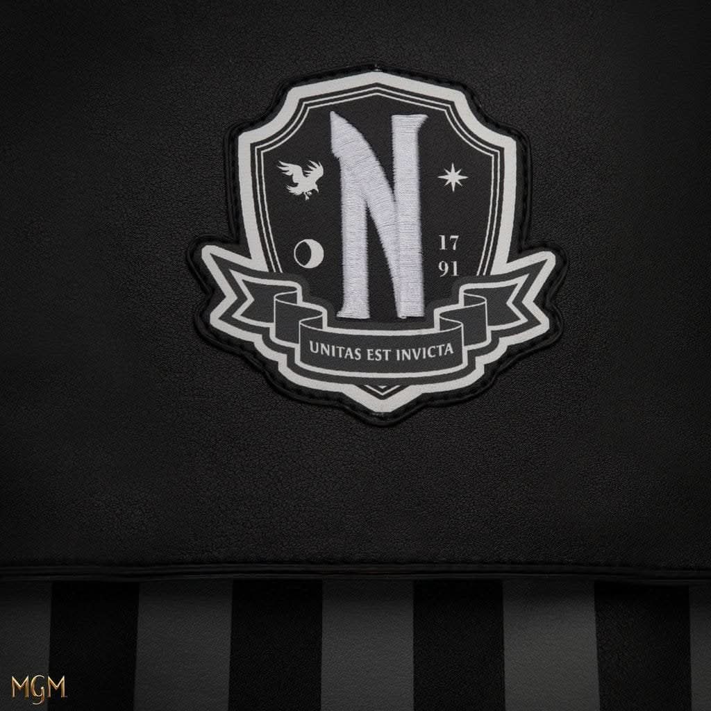 For those who resonate with Wednesday Addams' individuality and unapologetic style, this Black Nevermore Academy Backpack is the perfect accessory. Inspired by her black and grey take of her blazer, this backpack is a reflection of Wednesday's individuality.
