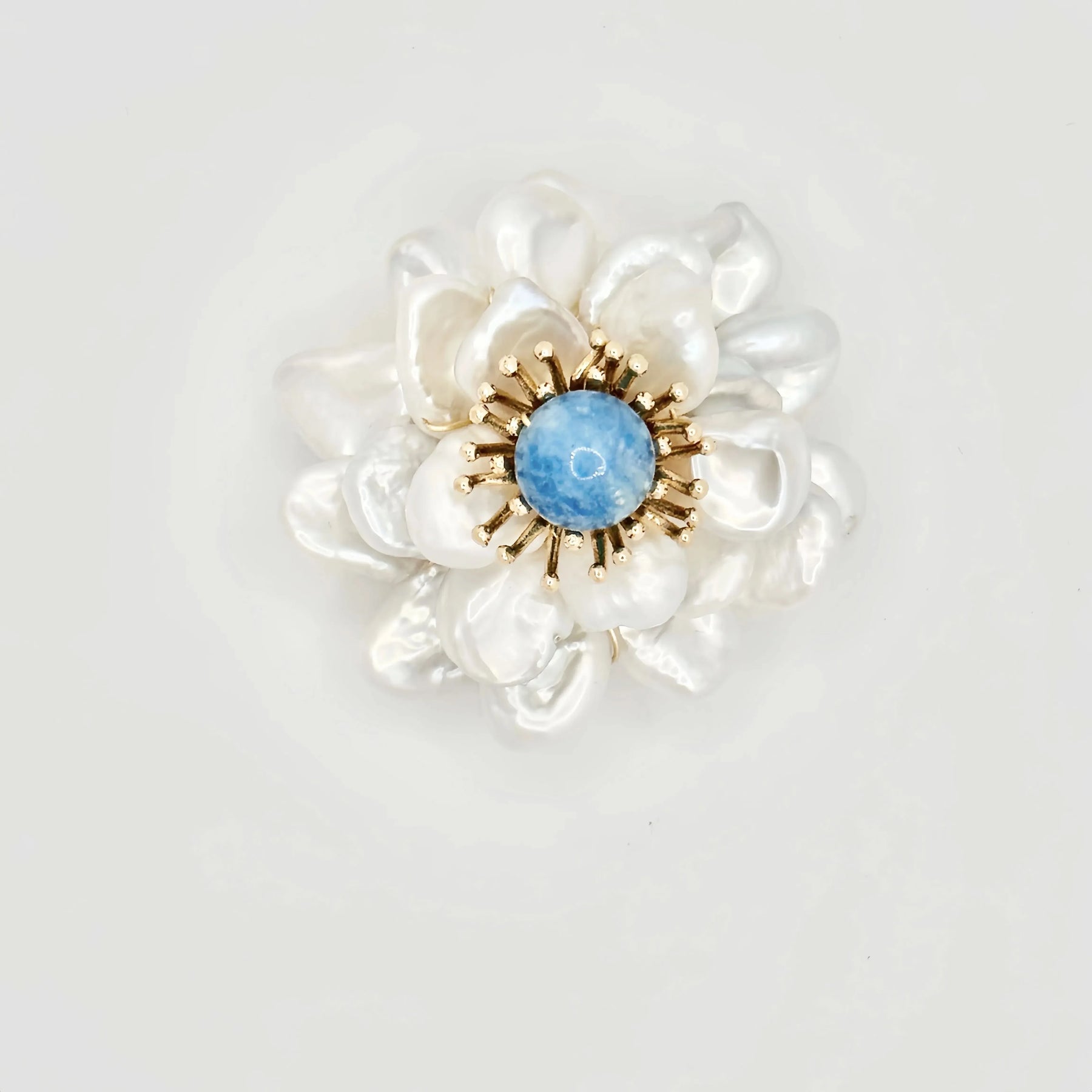 Hand-assembled with layers of natural baroque freshwater pearls, each petal shines with organic lustre and unique character, circling a tranquil sky-blue gemstone at the heart.