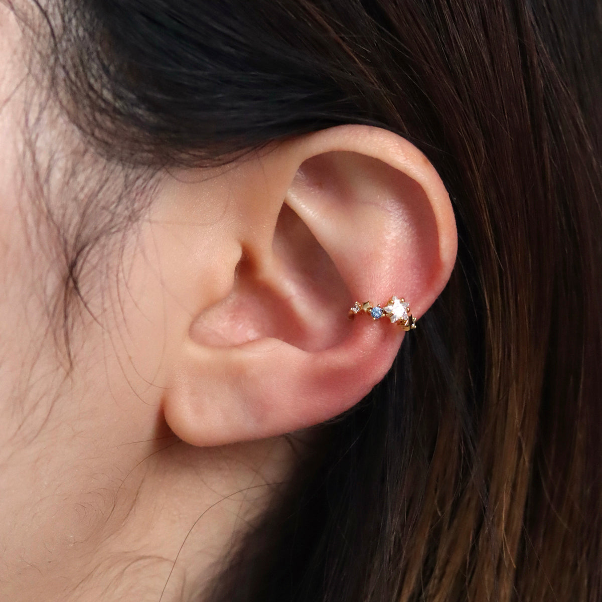 Expertly crafted with delicate details, the Blue Star Cuff adds a touch of elegance to any outfit. Featuring a sparkling cubic zirconia star surrounded by vibrant blue gemstone and rose quartz circles, topped off with charming stars, this unique ear cuff is an eye-catching addition to your jewelry collection.