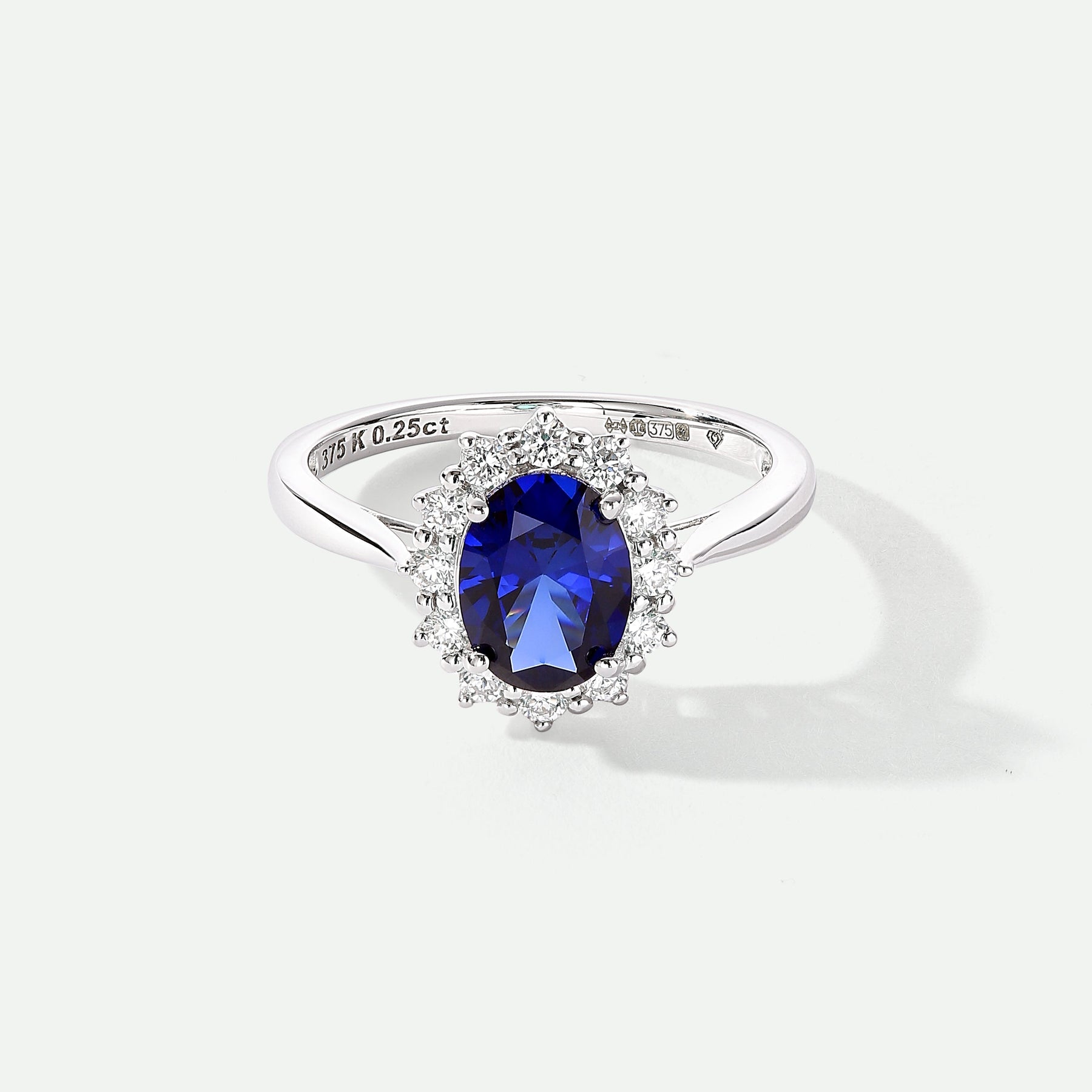 Our lab grown diamond and created sapphire Cate ring is set with a vivid blue created sapphire centre stone framed by a cluster of lab grown diamonds. Beautifully crafted in 9 carat white gold, the lab grown diamonds have a total weight of 0.25ct. Free UK delivery is available.