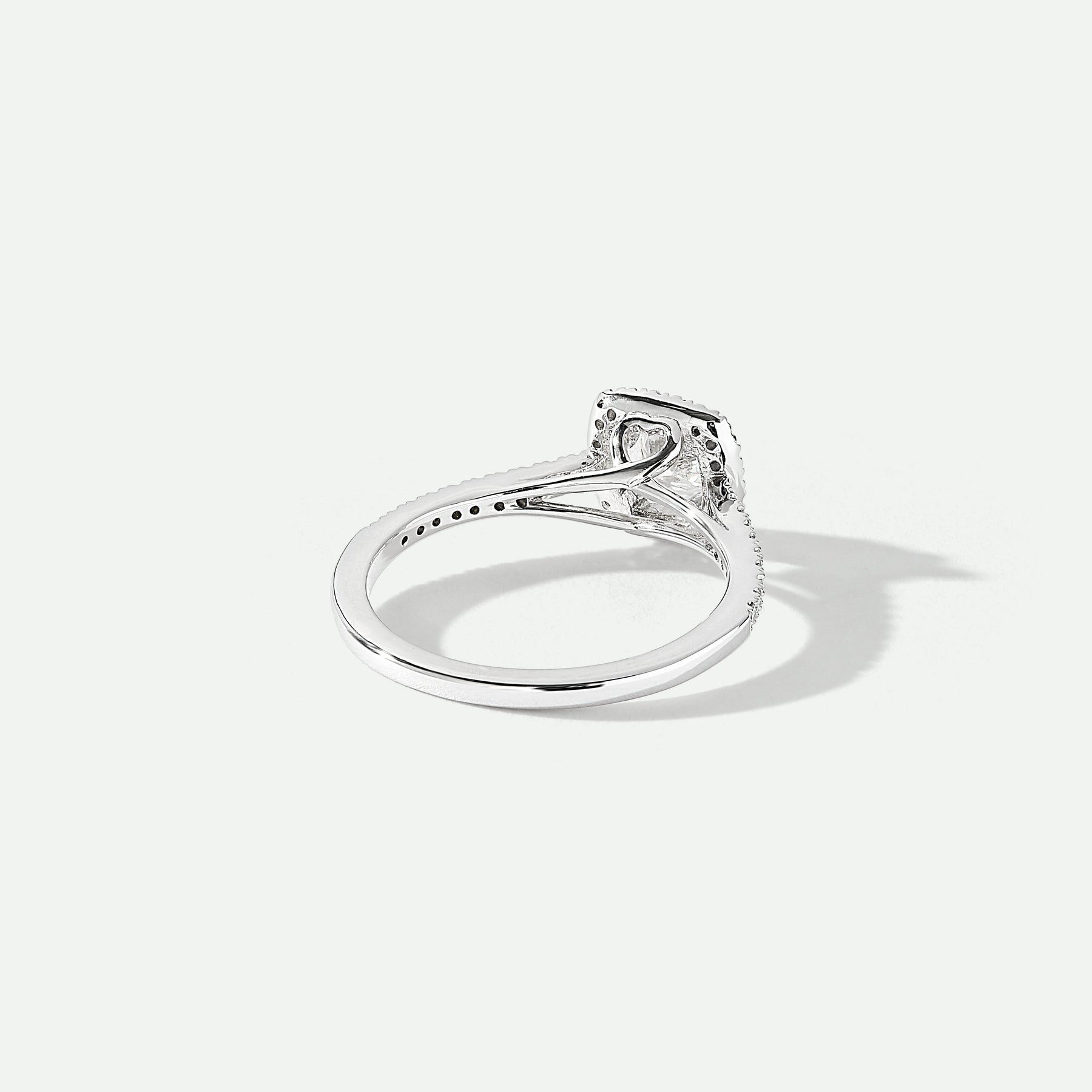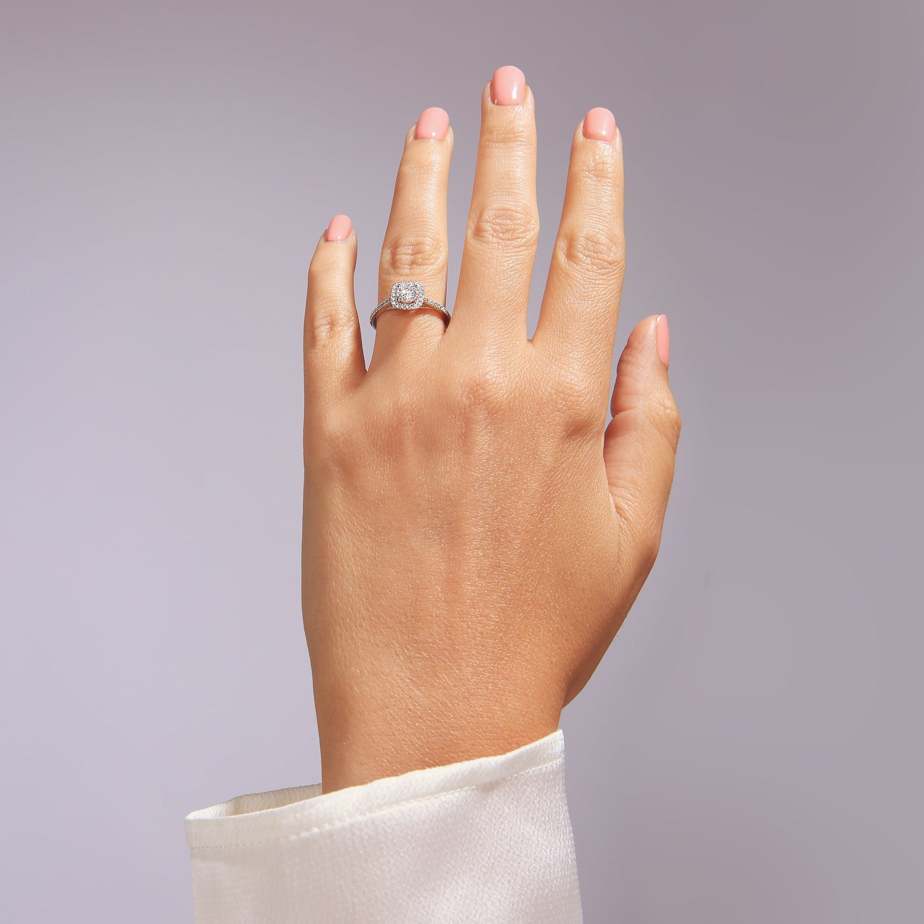 Delicately crafted in gleaming 9 carat white gold, this gorgeous ring design features a sparkling round cut 0.50ct lab grown solitaire diamond, framed by a 0.20ct cushion-shaped halo of pavé set diamonds.