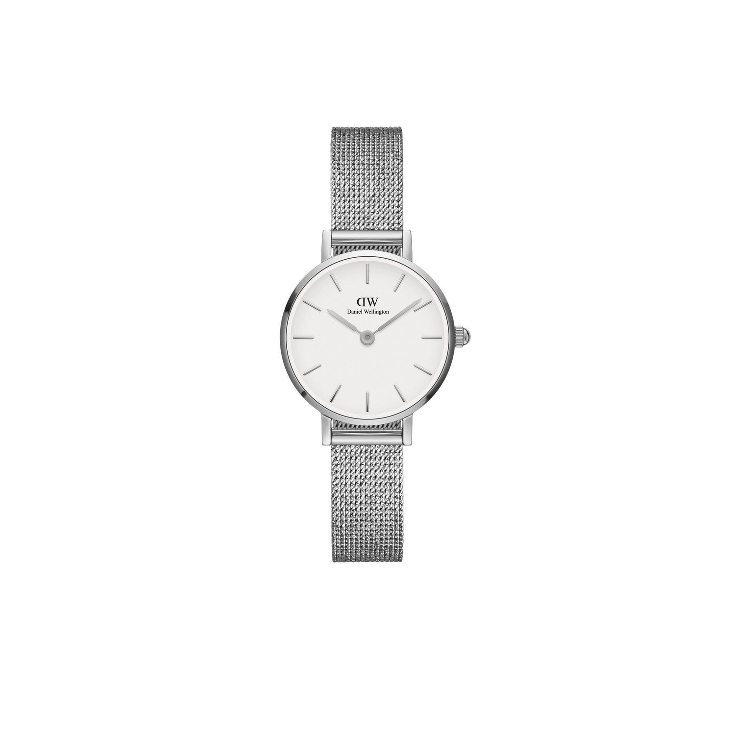 DW’s most delicate Petite: a 24 mm silver pressed-mesh bracelet with a crisp eggshell-white dial. Understated, feather-light, and easy to wear daily.