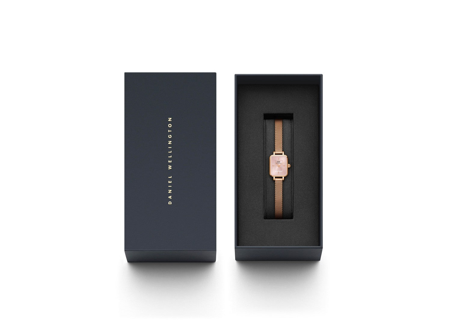 DW’s tiniest Quadro: a compact blush-pink sunray dial in a rose-gold rectangular case with a delicate mesh bracelet. Watch meets jewelry.