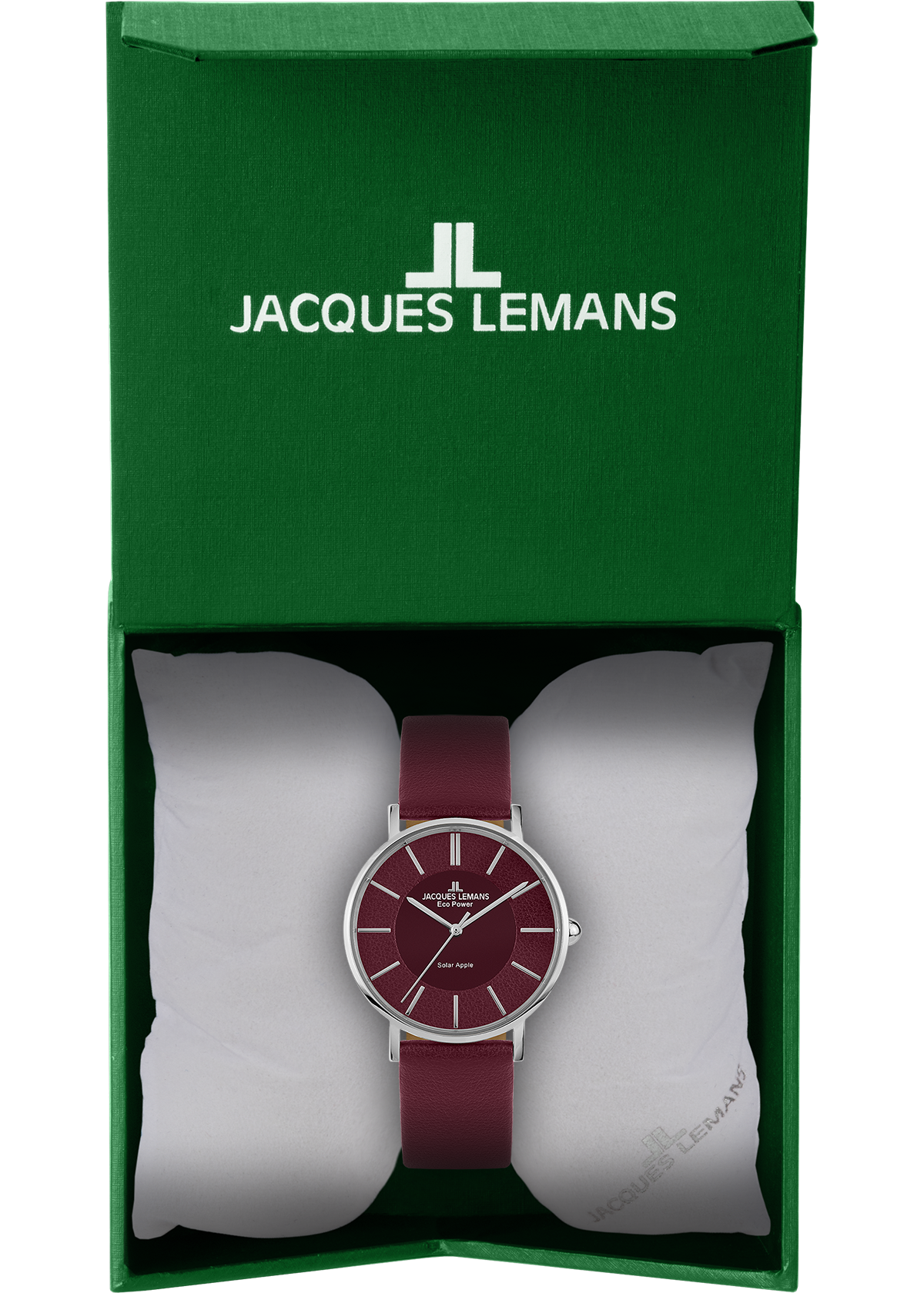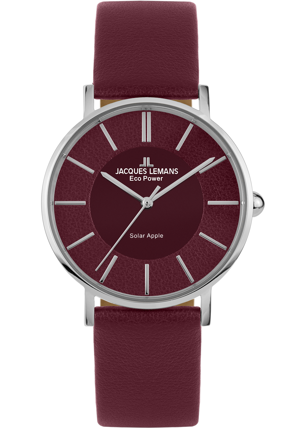 The brand-new Eco Power - Solar Collection from Jacques Lemans perfectly combines the use of latest solar technology, eco-friendly materials as well as stylish design. The dial is made of sustainable vegan apple skin and paired beautifully with a burgundy apple skin strap.