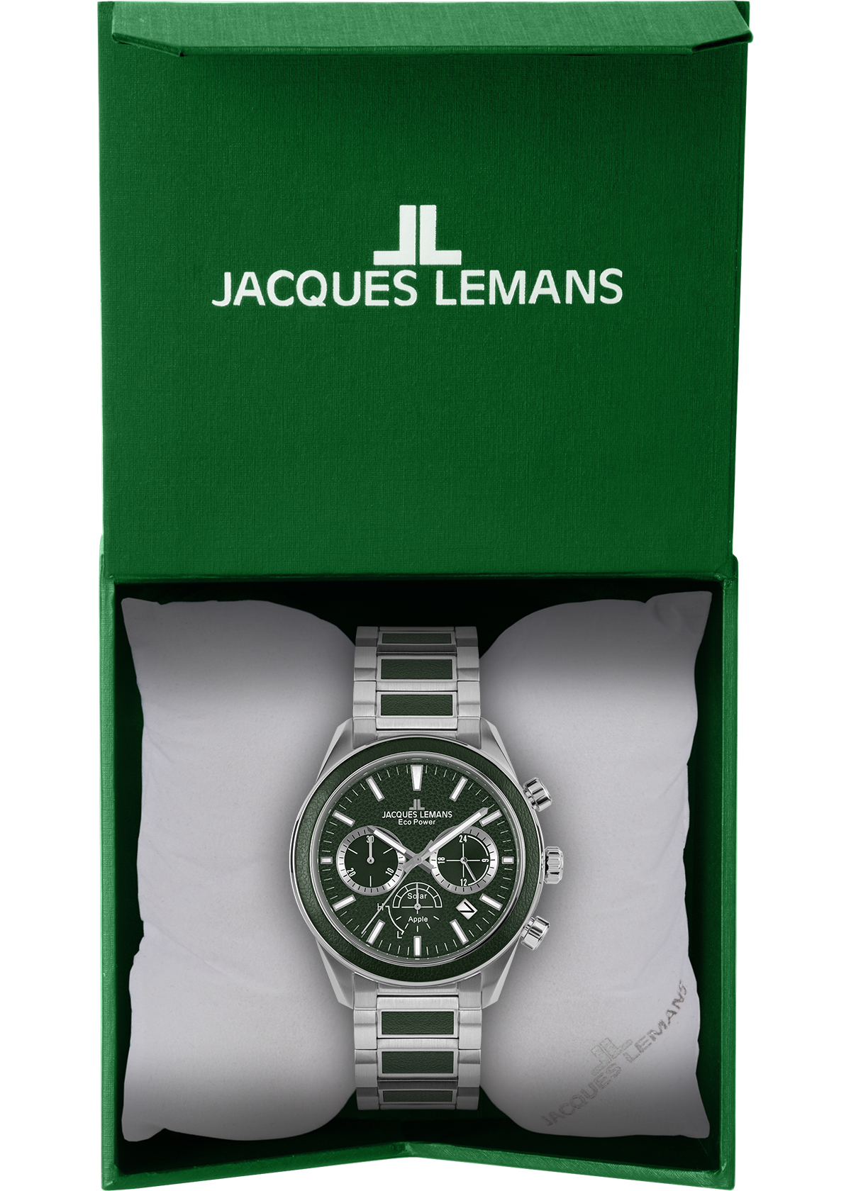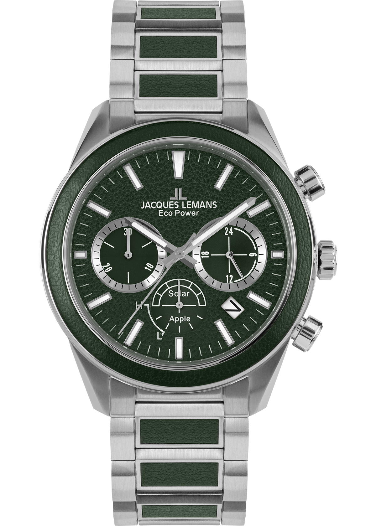 The brand-new Eco Power - Solar Collection from Jacques Lemans perfectly combines the use of latest solar technology, eco-friendly materials as well as classic design. The chronograph has got a stop watch, minute and second counter and a power reserve of up to 180 days. The dial is made of beautiful vegan apple skin, which is highly sustainable. The perfect companion for both business and leisure.