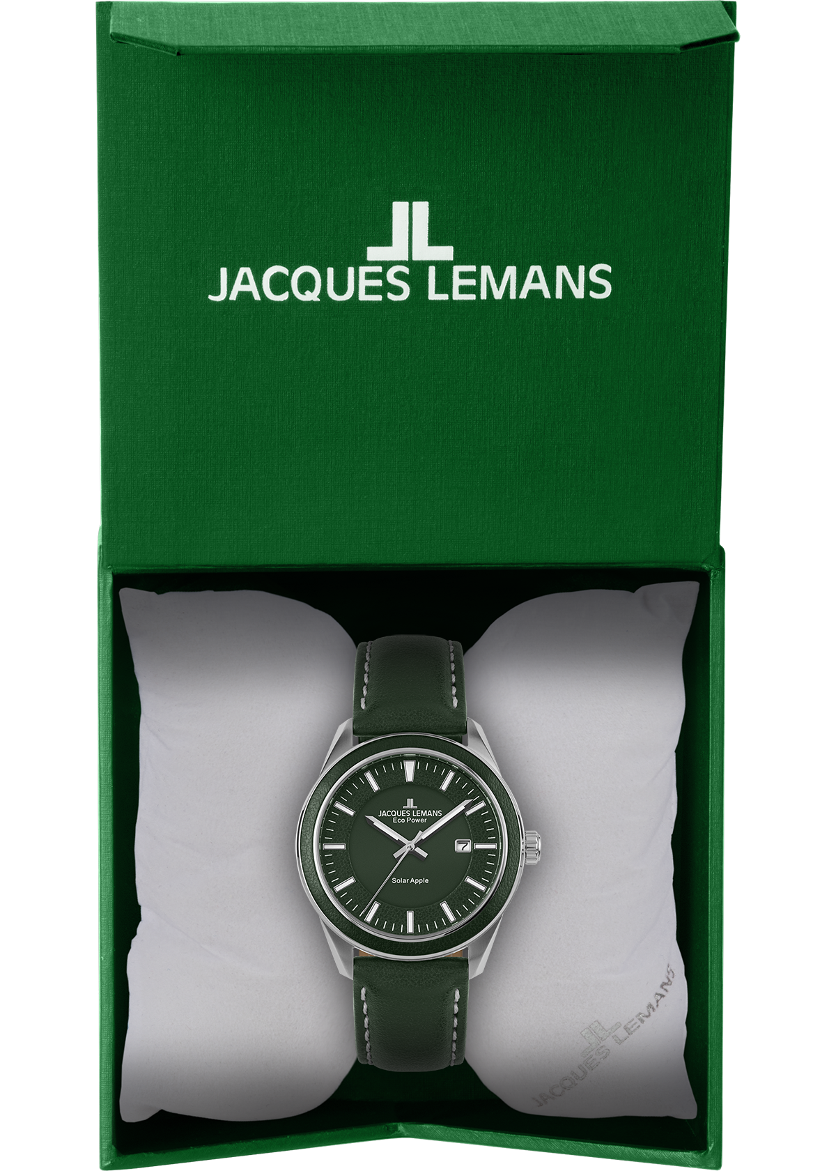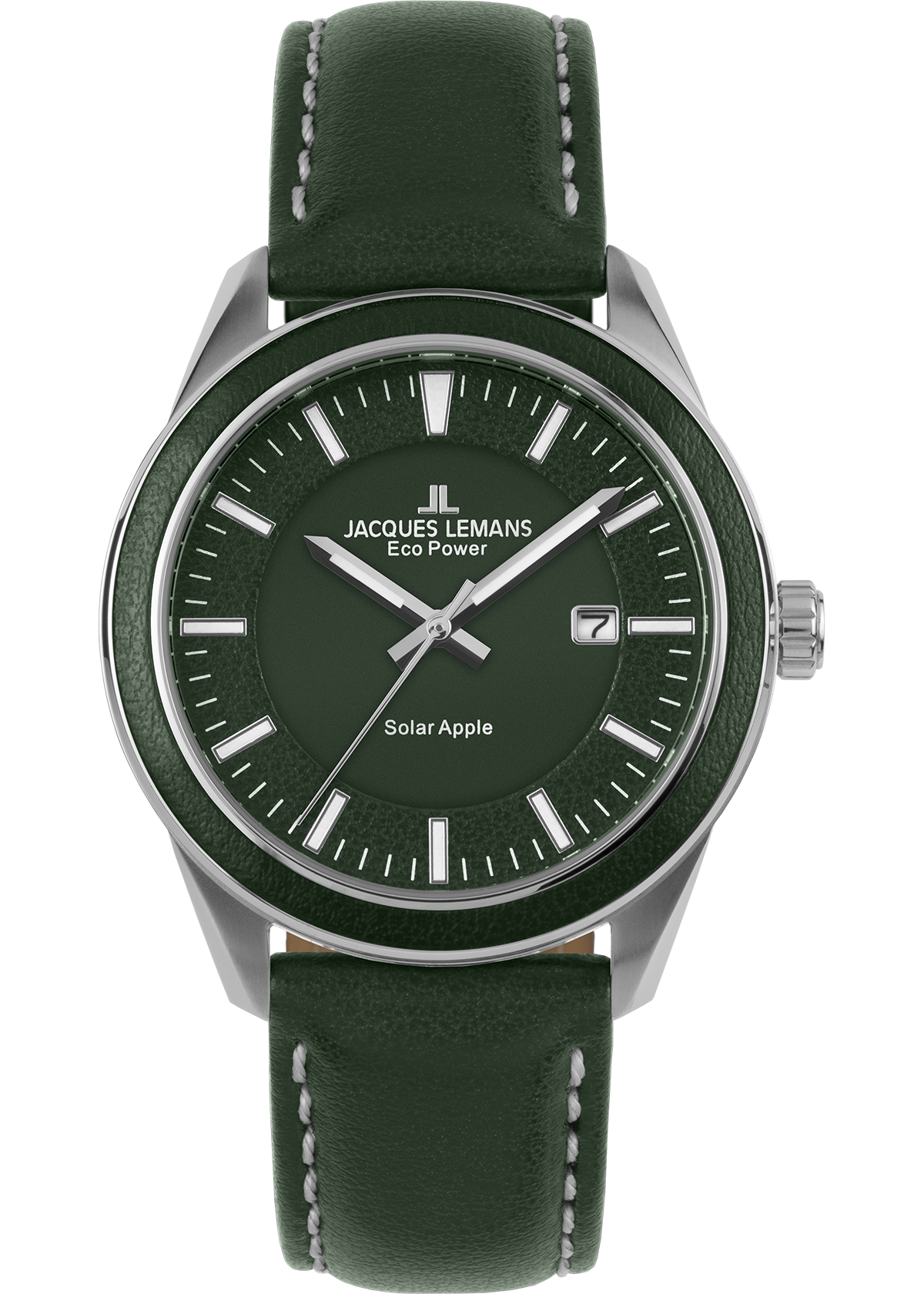 The brand-new Eco Power - Solar Apple Collection from Jacques Lemans perfectly combines the use of latest solar technology, eco-friendly materials as well as stylish design. The dial is made of sustainable vegan apple skin and paired beautifully with a green apple skin strap.