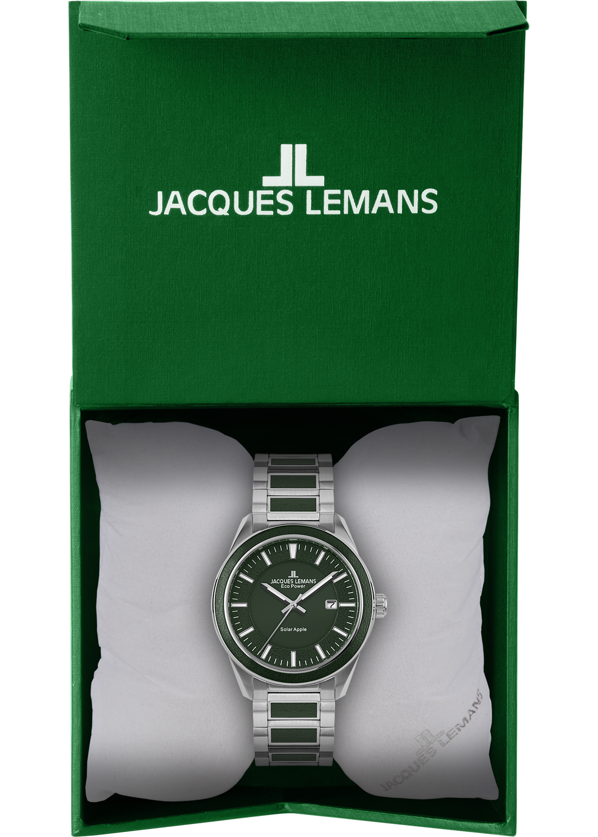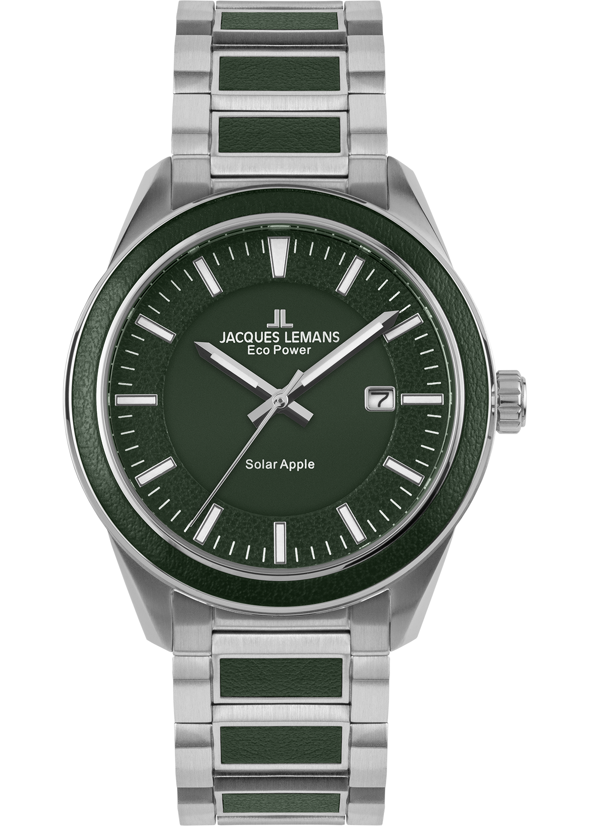 The brand-new Eco Power - Solar Apple Collection from Jacques Lemans perfectly combines the use of latest solar technology, eco-friendly materials as well as stylish design. The dial is made of sustainable vegan apple skin and paired beautifully with a Stainless Steel and green apple skin inlay strap.