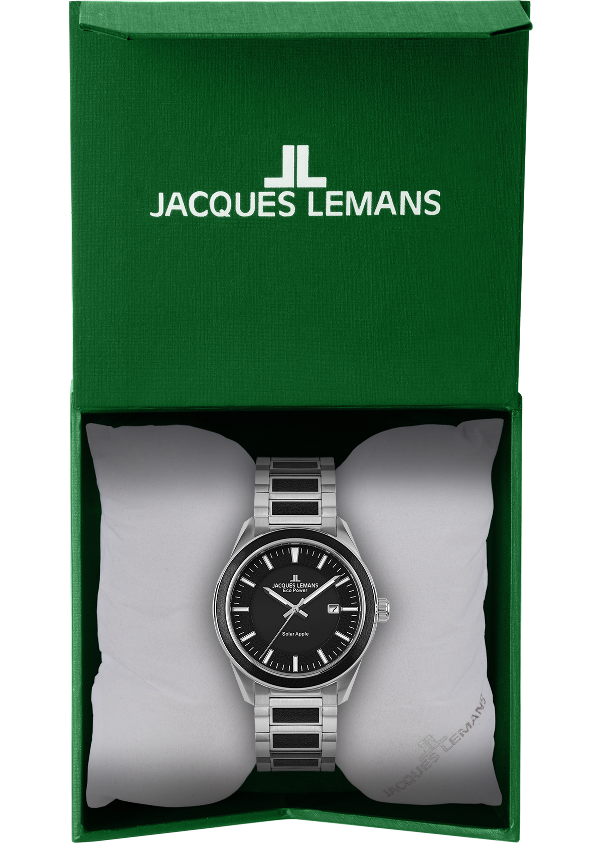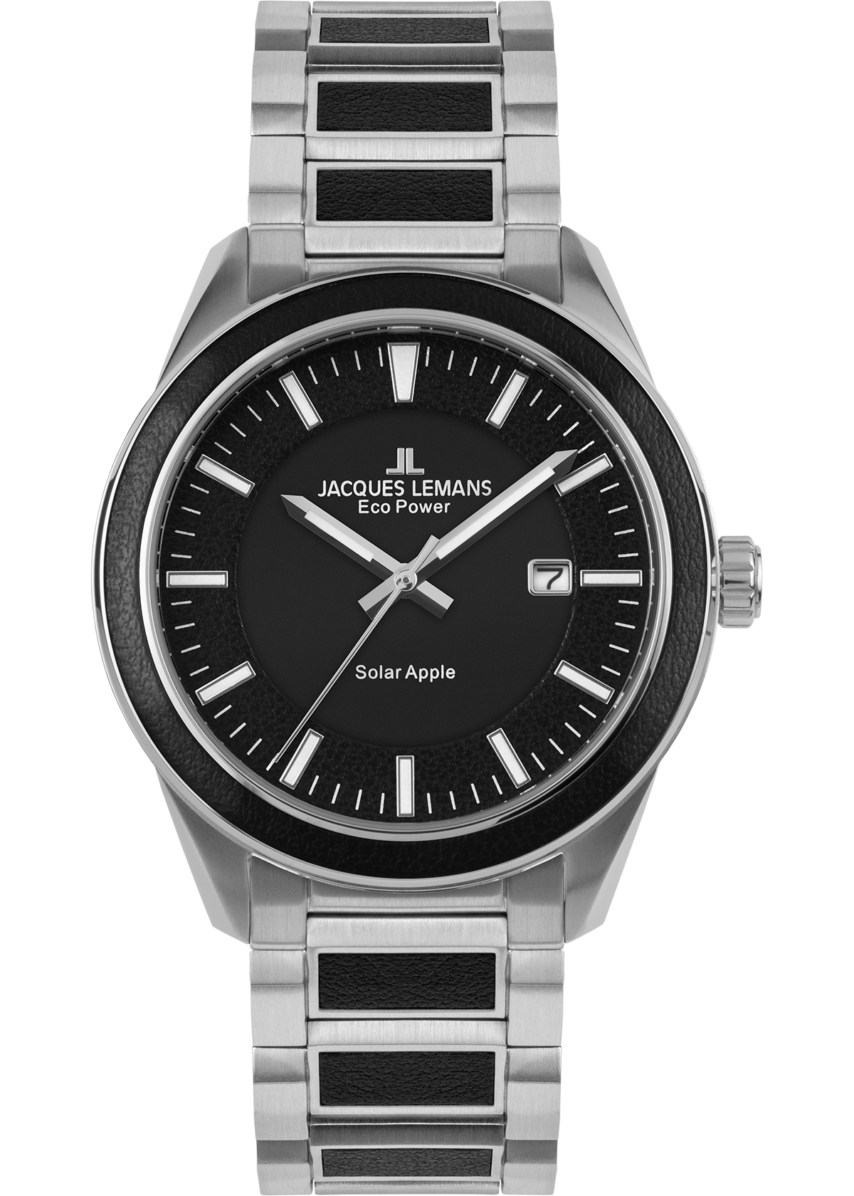 The brand-new Eco Power - Solar Apple Collection from Jacques Lemans perfectly combines the use of latest solar technology, eco-friendly materials as well as stylish design. The dial is made of sustainable vegan apple skin and paired beautifully with a Stainless Steel and black apple skin inlay strap.
