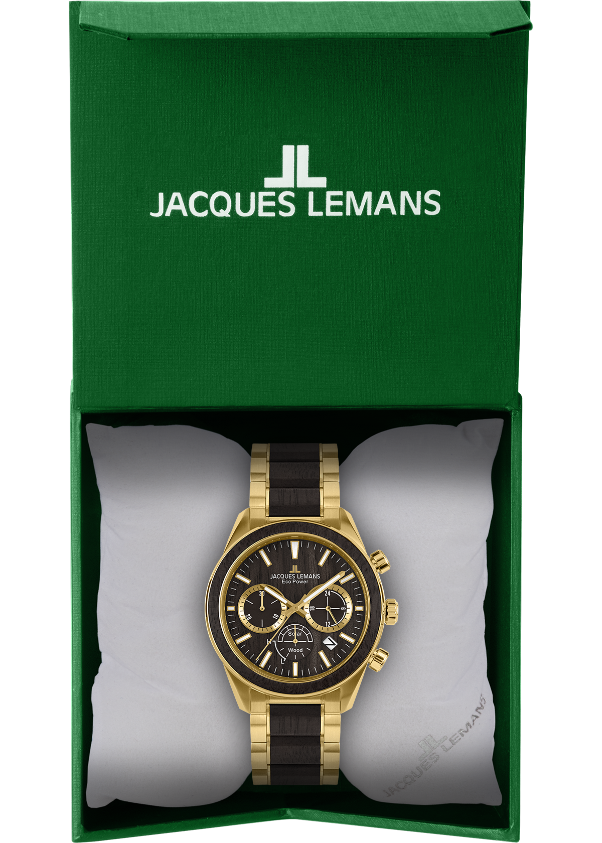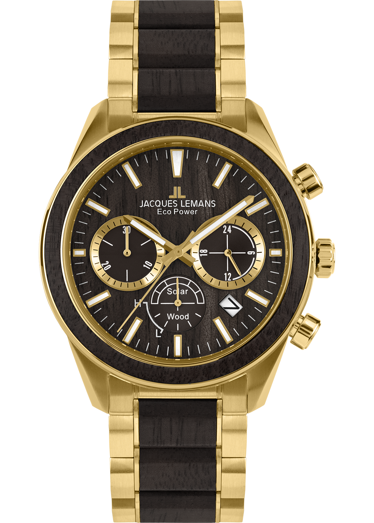 The brand-new Eco Power - Solar Collection from Jacques Lemans perfectly combines the use of latest solar technology, eco-friendly materials as well as classic design. The chronograph has got a stop watch, minute and second counter and a power reserve of up to 180 days. Paired with the strap made of brown vegan apple skin inlays, the dial is made of beautiful walnut, a special wood grain. The perfect companion for both business and leisure.