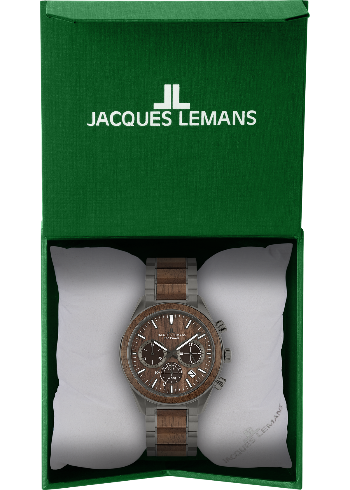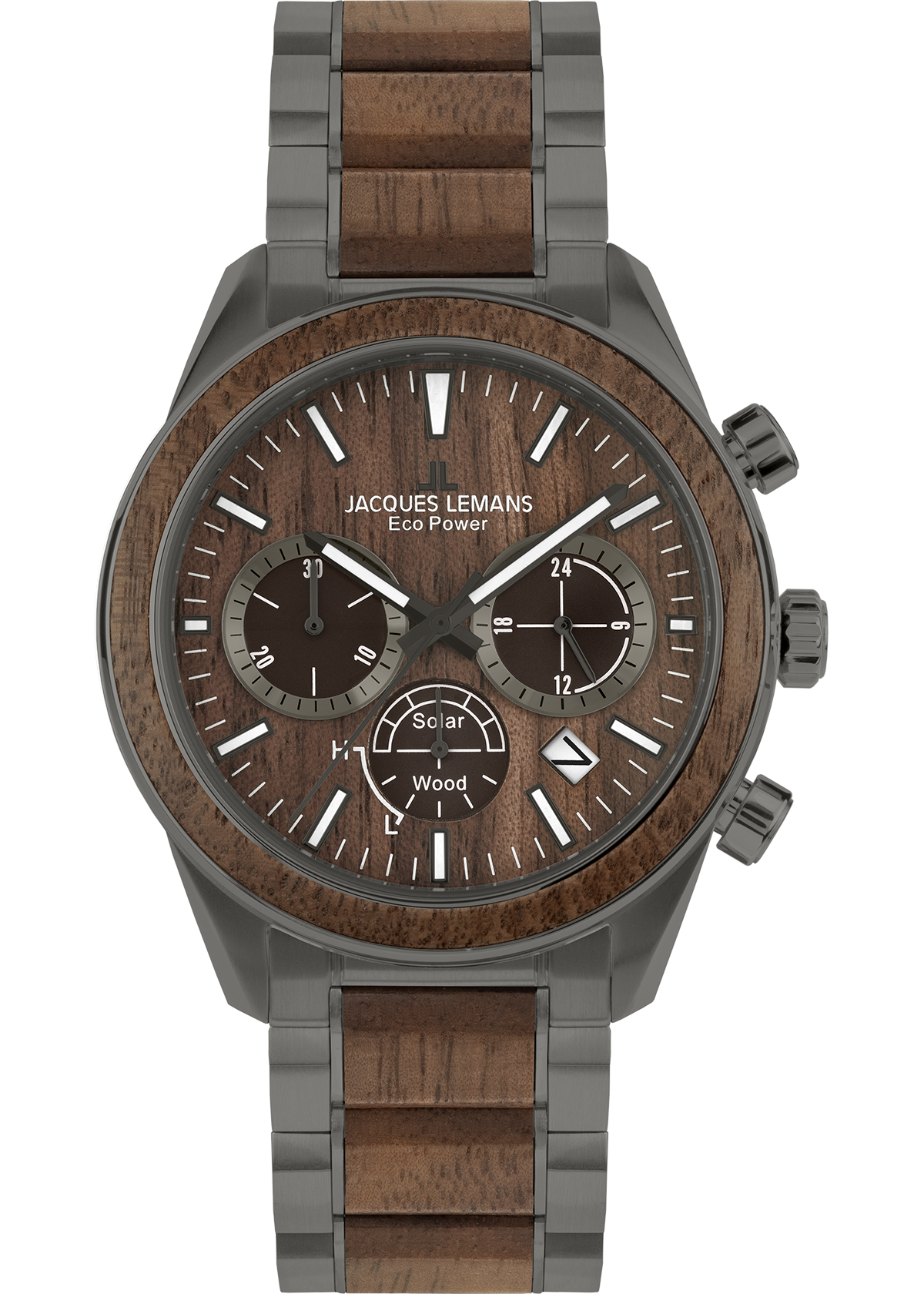 The brand-new Eco Power - Solar Collection from Jacques Lemans perfectly combines the use of latest solar technology, eco-friendly materials as well as classic design. The chronograph has got a stop watch, minute and second counter and a power reserve of up to 180 days. Paired with the strap made of vegan apple skin inlays, the dial is made of beautiful walnut, a special wood grain. The perfect companion for both business and leisure.