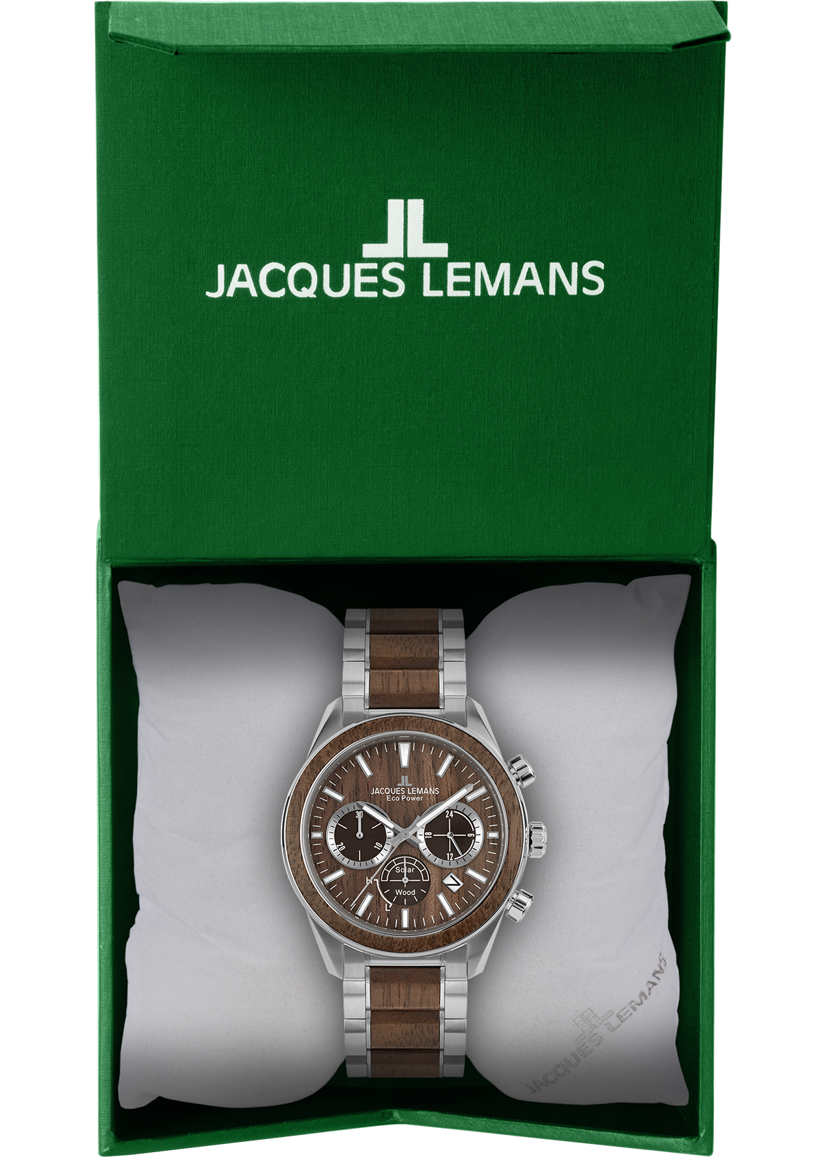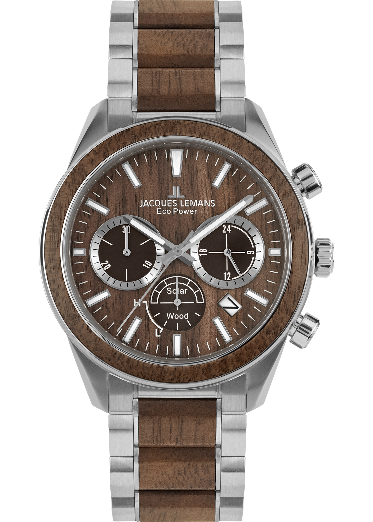 The brand-new Eco Power - Solar Collection from Jacques Lemans perfectly combines the use of latest solar technology, eco-friendly materials as well as classic design. The chronograph has got a stop watch, minute and second counter and a power reserve of up to 180 days. Paired with the strap made of vegan apple skin inlays, the dial is made of beautiful walnut, a special wood grain. The perfect companion for both business and leisure.