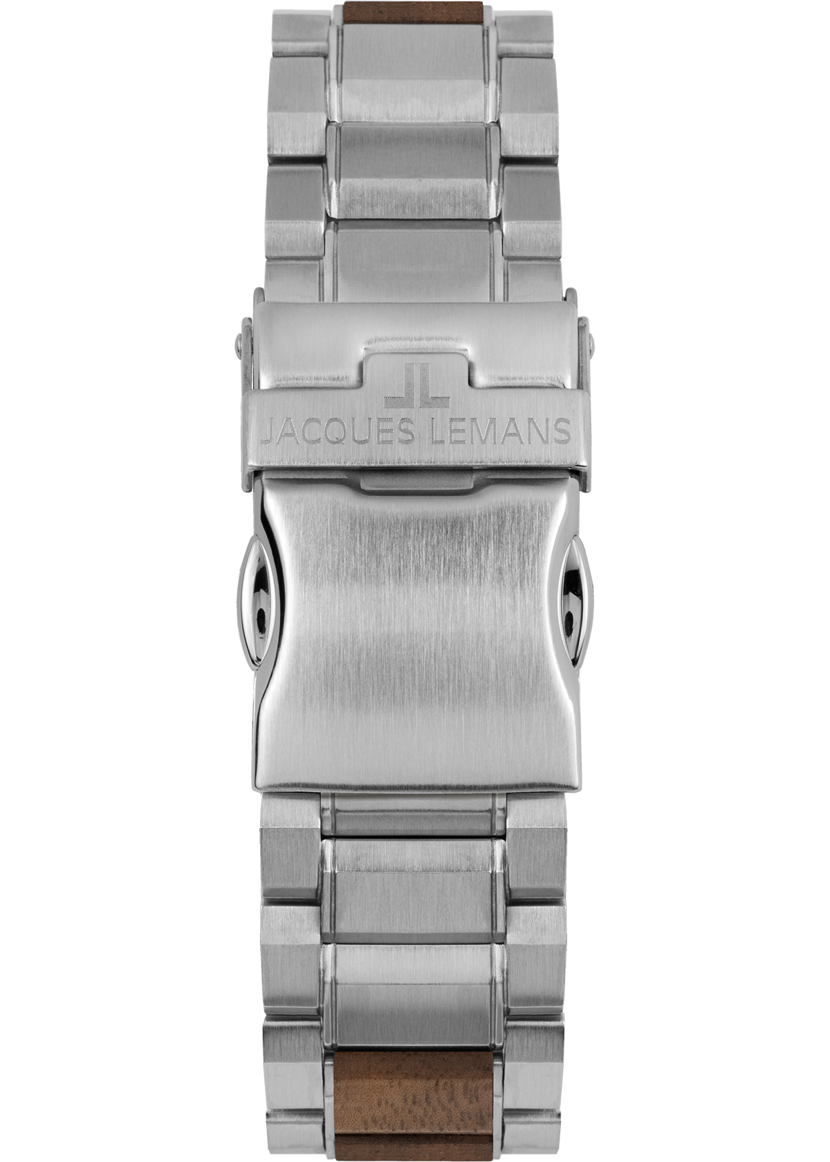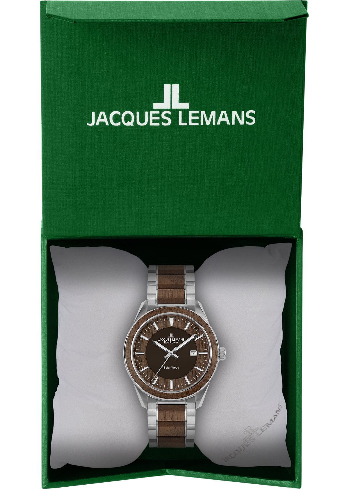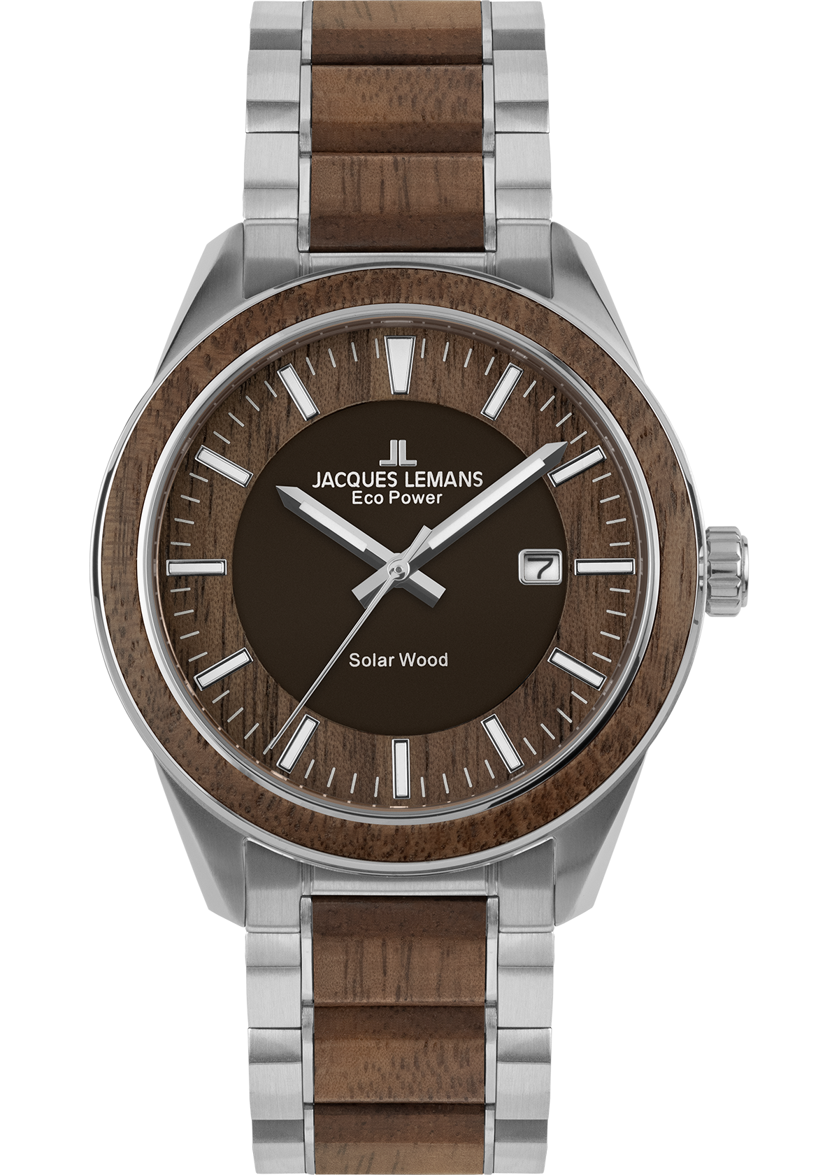The brand-new Eco Power - Solar Collection from Jacques Lemans perfectly combines the use of latest solar technology, eco-friendly materials as well as classic design. The dial is made of walnut, a special wood grain. Together with the stainless steel bracelet and light brown wood inlays this chonograph watch is the perfect companion for both business and leisure.