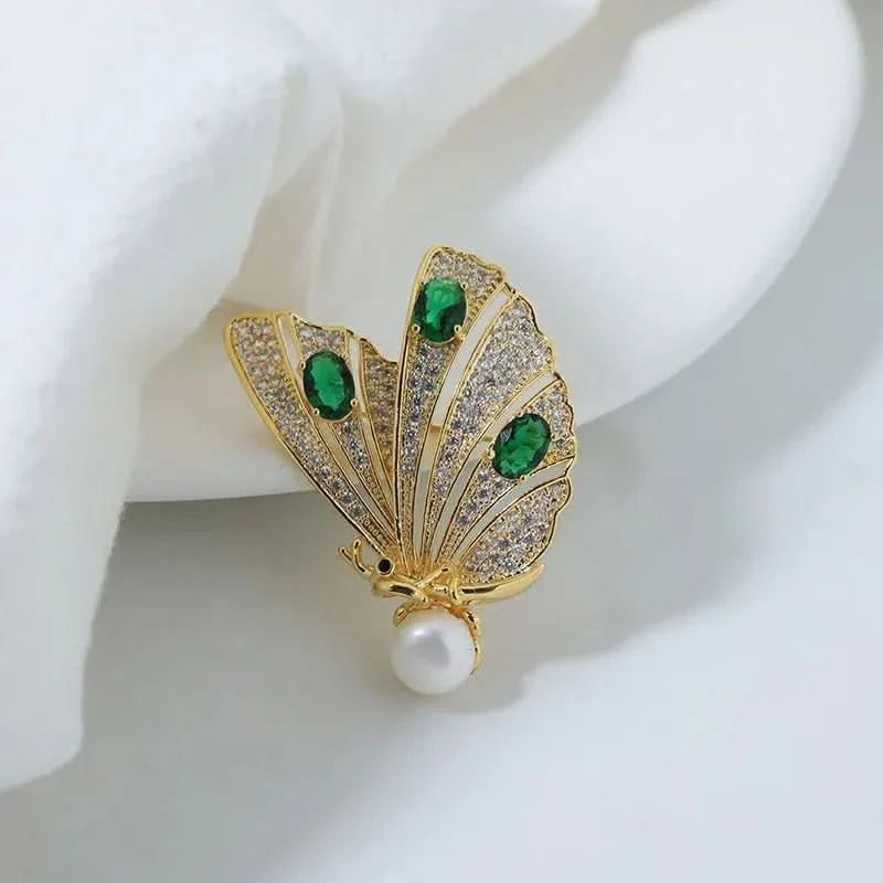Embrace the beauty of nature with our Exquisite Butterfly Brooch, a stunning blend of elegance and sophistication. Designed to captivate, this brooch features brilliant zircon stones set in radiant 18K gold plating, with shimmering emerald-green accents adorning the butterfly’s delicate wings. A lustrous freshwater pearl completes the piece, adding a timeless touch of luxury.