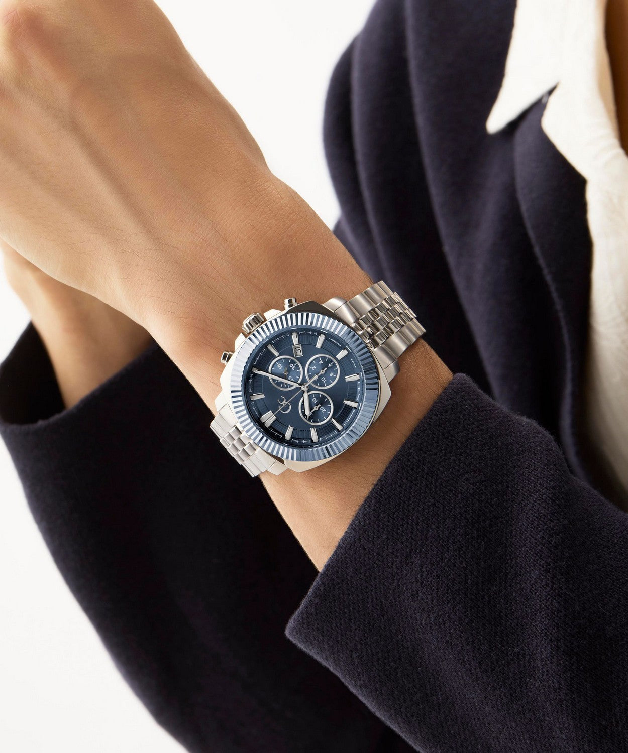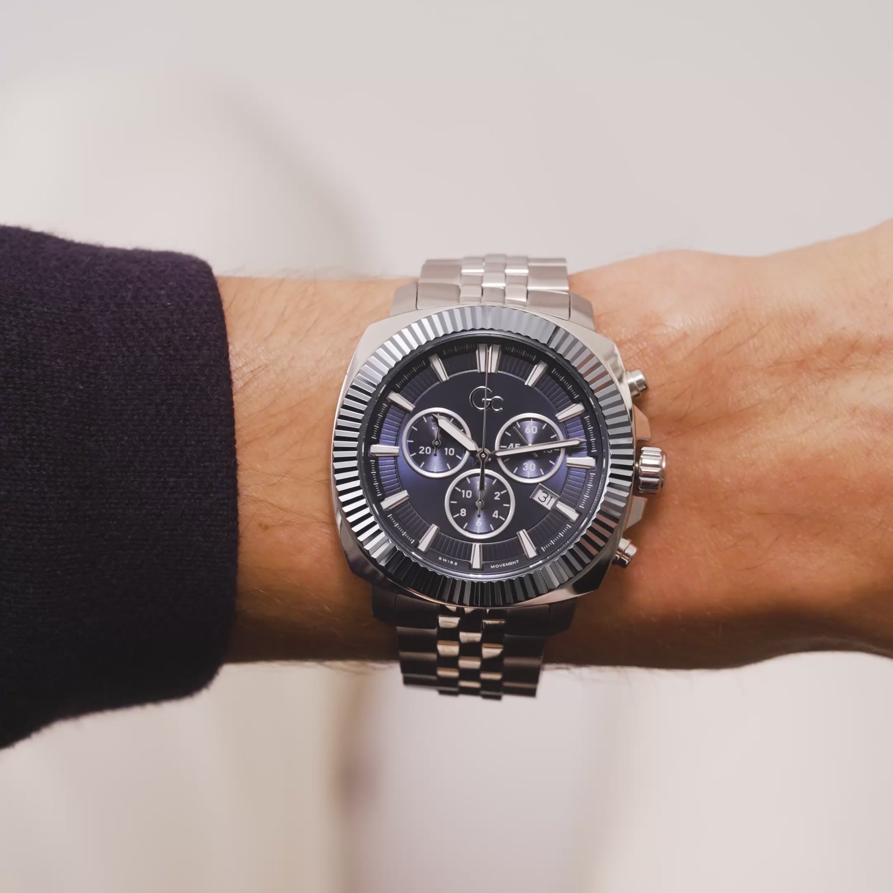 Vintage yet contemporary, the sleek male version of the Gc Flair Coussin stands out. This stylish timepiece features a distinctive notched bezel and a comfortable, supple five-link bracelet. This silver tone version comes with a stunning stone blue PVD top ring and matching deep sunray dial, showcasing a chronograph movement.