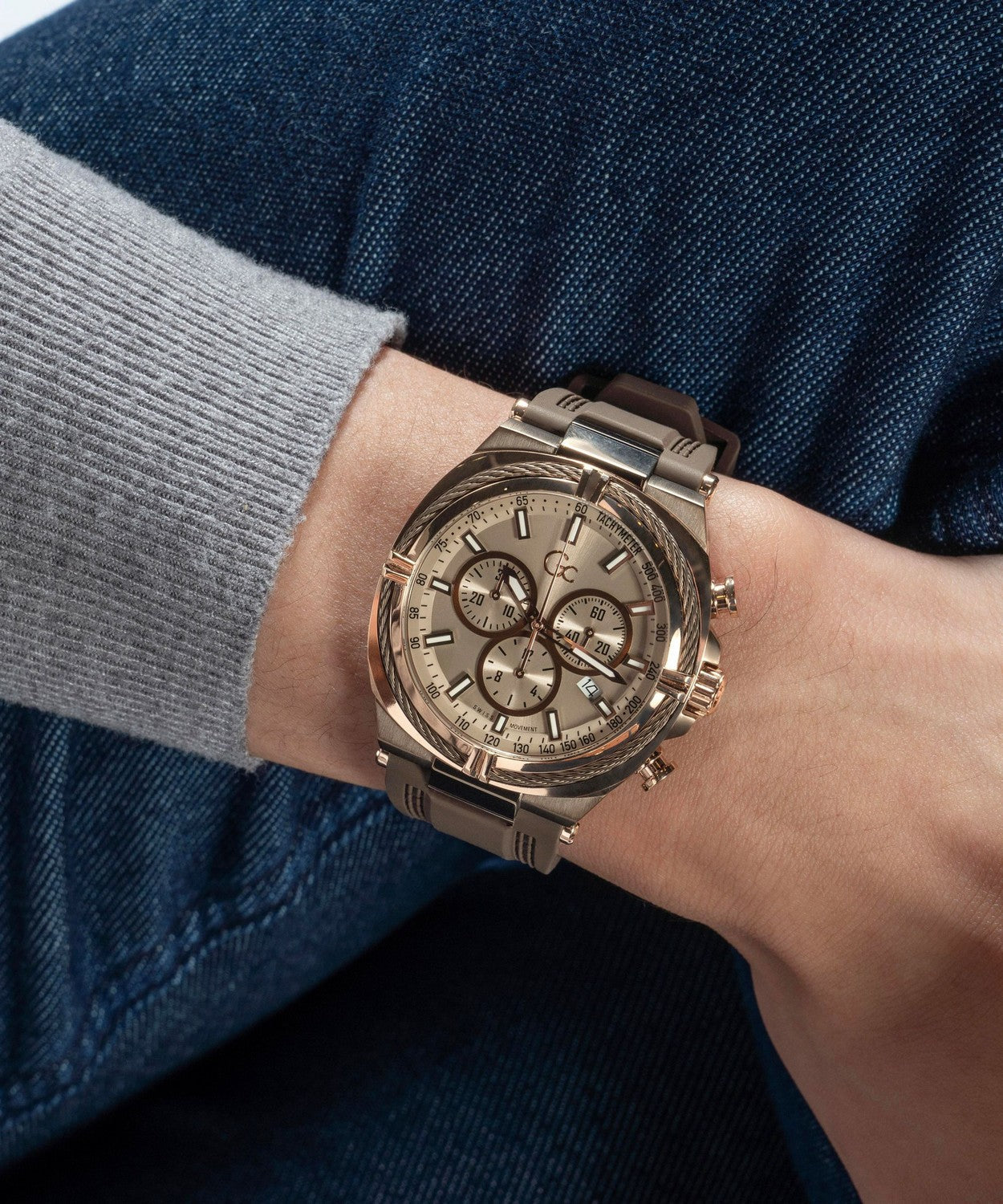 With its unique cable-wire on top ring - the Gc IronClass and its 43mm cushion case and chronograph movement shows a mix of coolness and sophistication. This warm brown and rose gold PVD version hosts a soft earthy beige dial and features a tasty chesnut brown silicone strap.