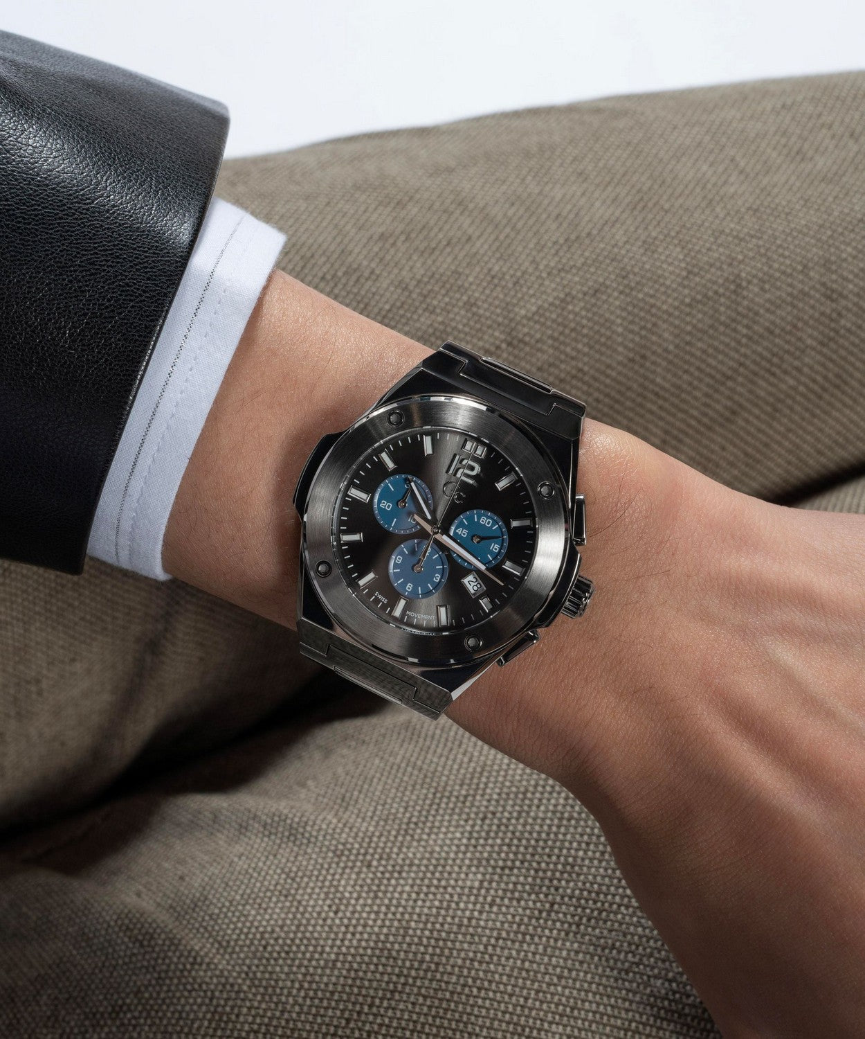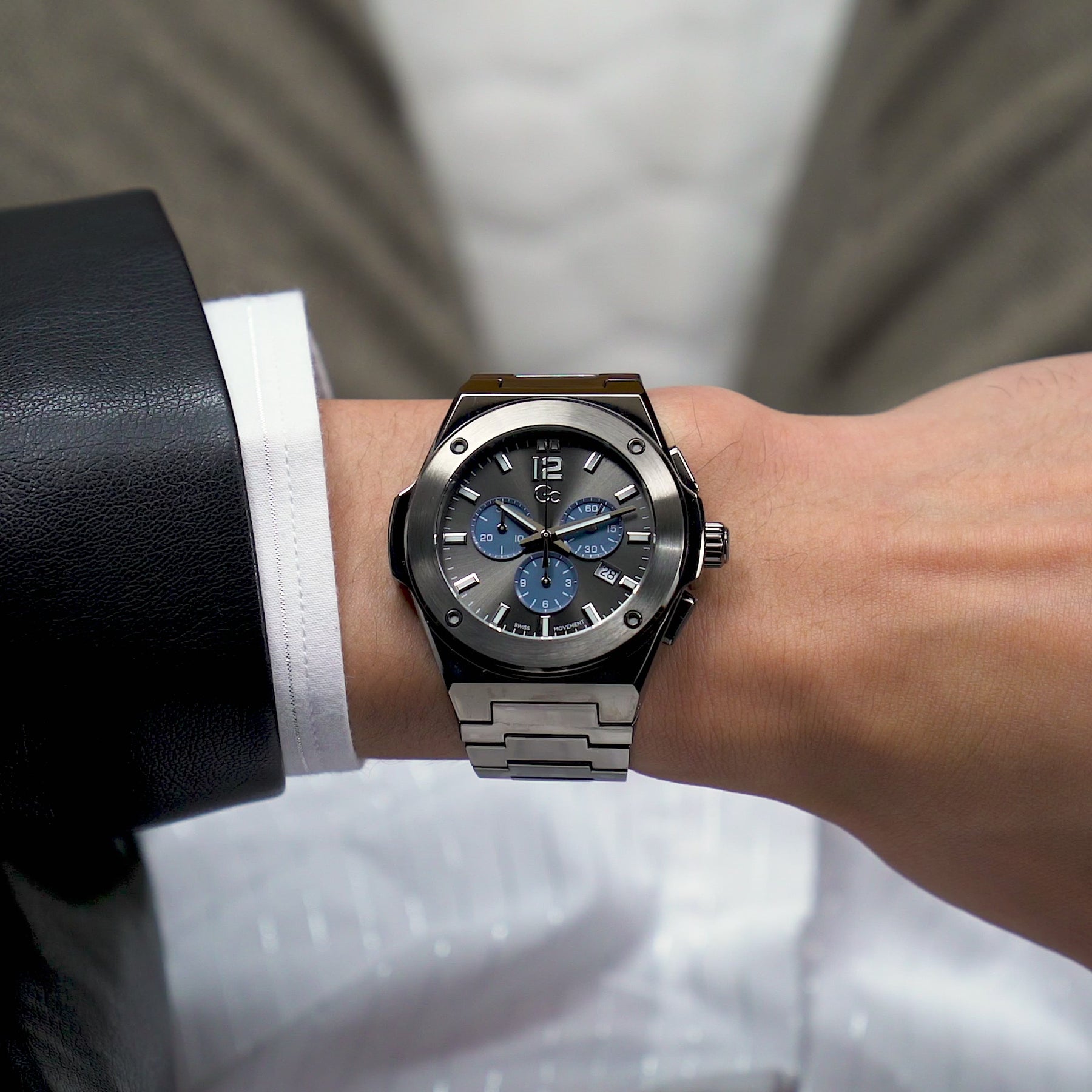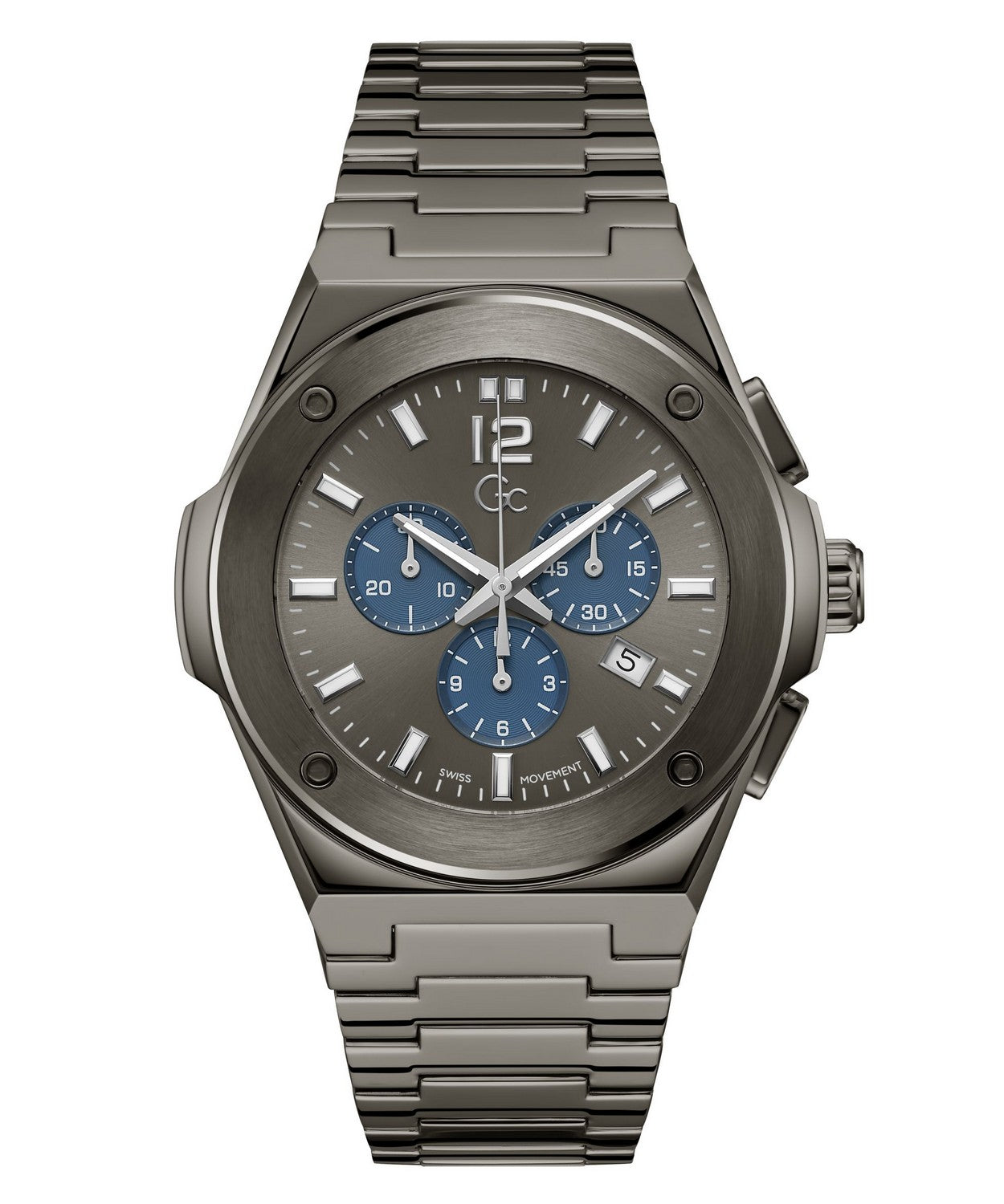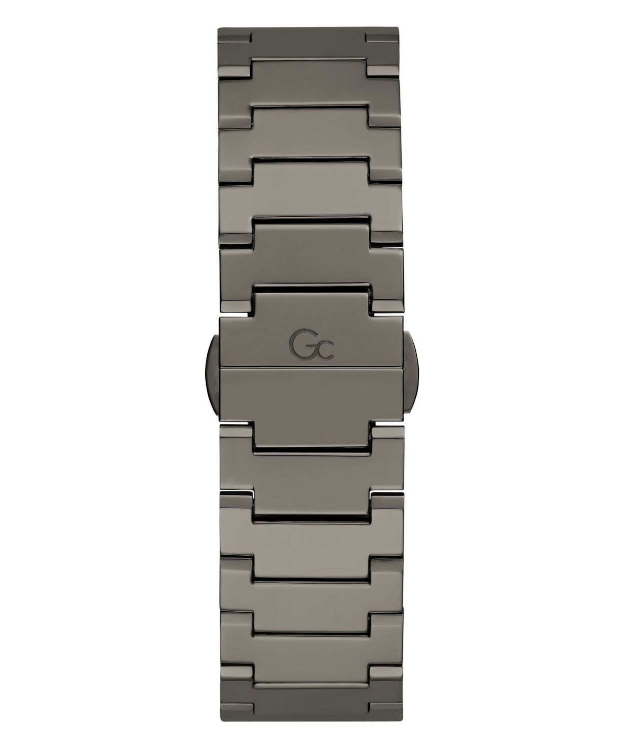 The Gc Idol hosts an integrated 44mm case with detailed top ring, contrasted dial, chronograph movement and smooth bracelet in full gunmetal PVD.