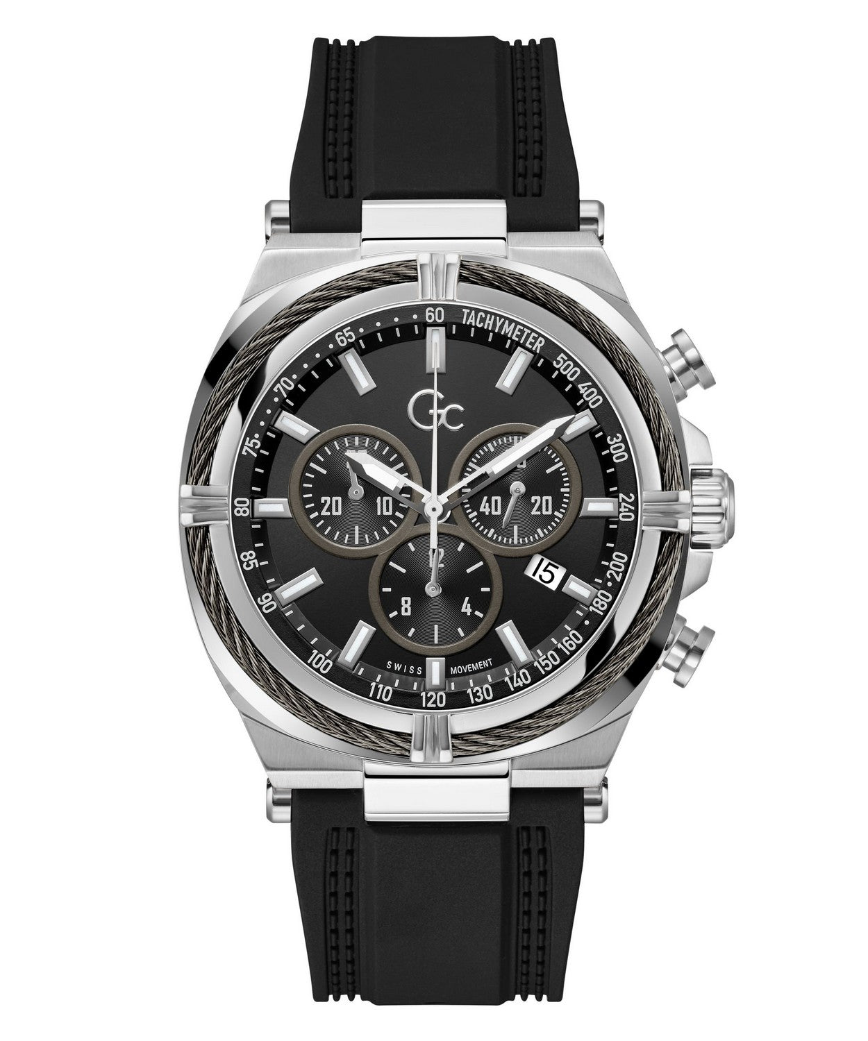 Engineered Presence. Everyday Power. The Gc IronClass is crafted for those who command the moment with confidence. Its 43mm round case, constructed from brushed and polished silver-tone stainless steel with gunmetal plating, delivers bold contrast and industrial sophistication. A black sunray dial anchors the design with depth and precision, framed by a scratch-resistant sapphire crystal that stands up to daily wear. Chronograph subdials and luminous detailing ensure function and clarity at a glance, while the black silicone strap brings a sporty, modern sensibility. Finished with a traditional buckle for a secure fit, its designed to move with you from morning to night. Powered by a Swiss-made movement and water-resistant to 100 meters, the Gc IronClass blends high-quality materials with performance-driven style. Its a watch built not just to be worn but to be lived in.