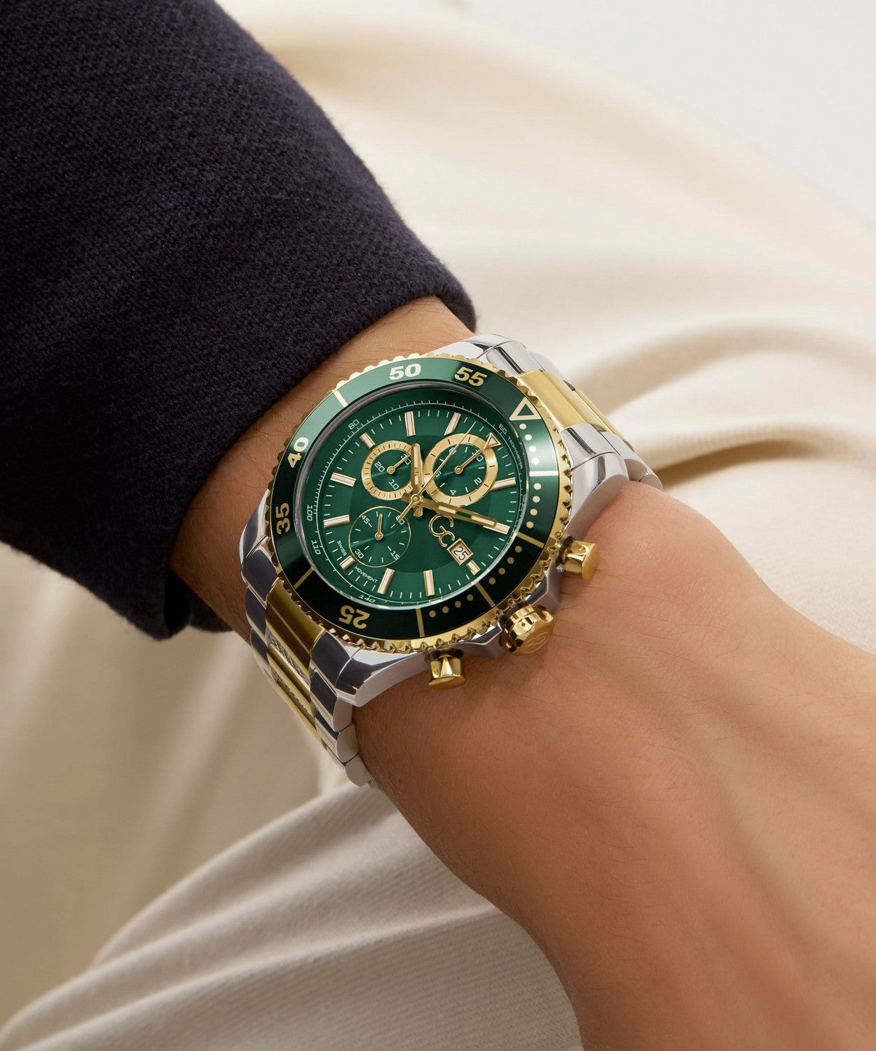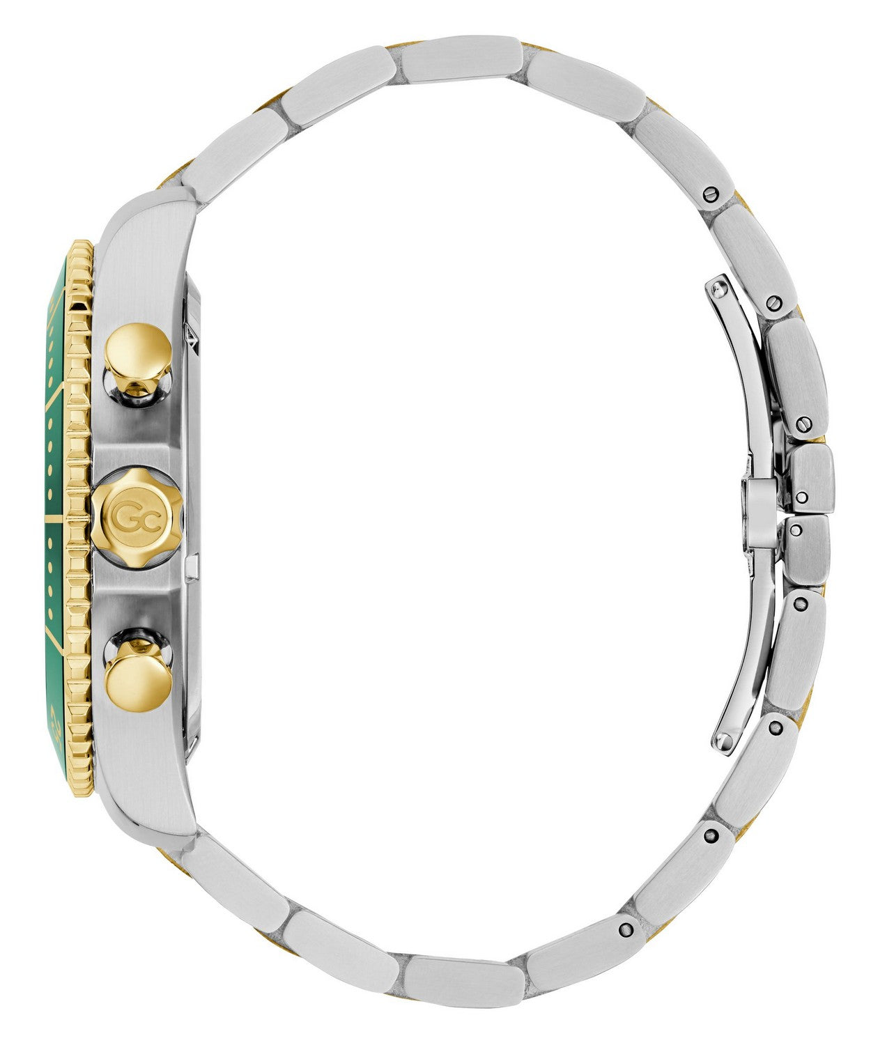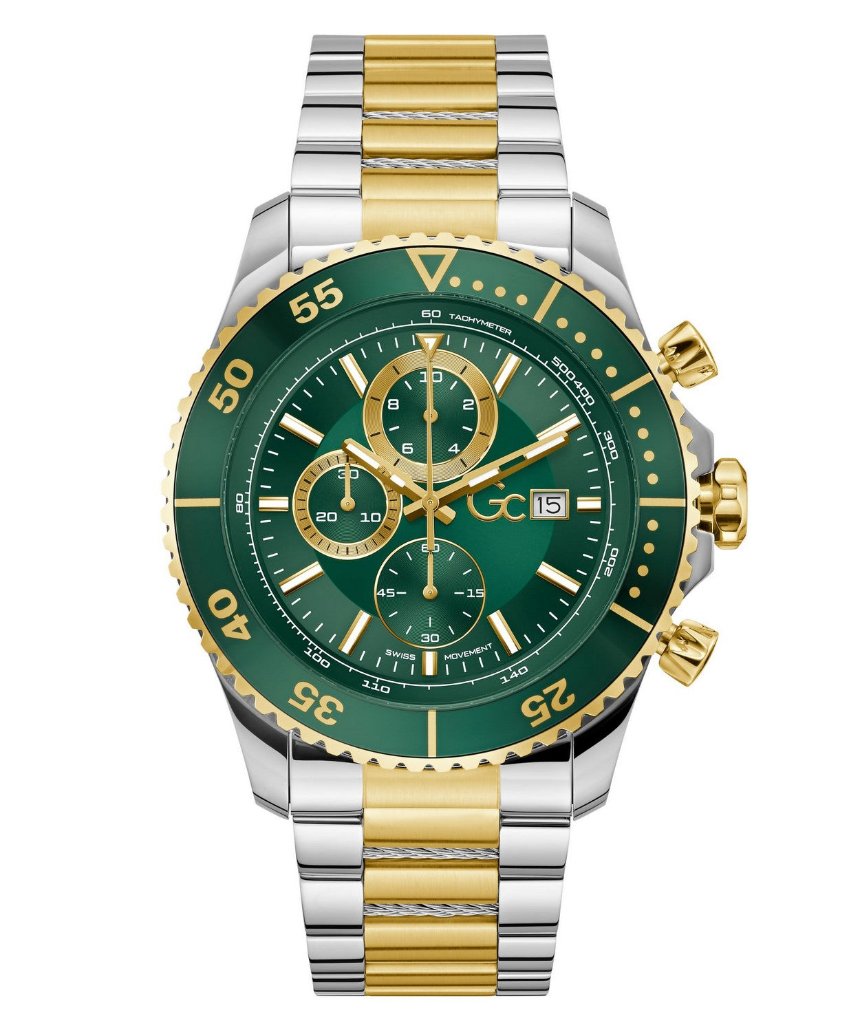 Stand out boldly with the spectacular Gc SpeedRacer diver-look chronograph. This impressive 44mm timepiece combines a striking silver case with yellow gold tone accents, complemented by a green rotating top ring and matching two-tone bracelet with subtle cable details. The stunning emerald green dial features distinctive asymmetrical sub-dials, creating a perfect balance of sporty sophistication and technical prowess. A commanding presence for those who appreciate exceptional design with unmistakable character.