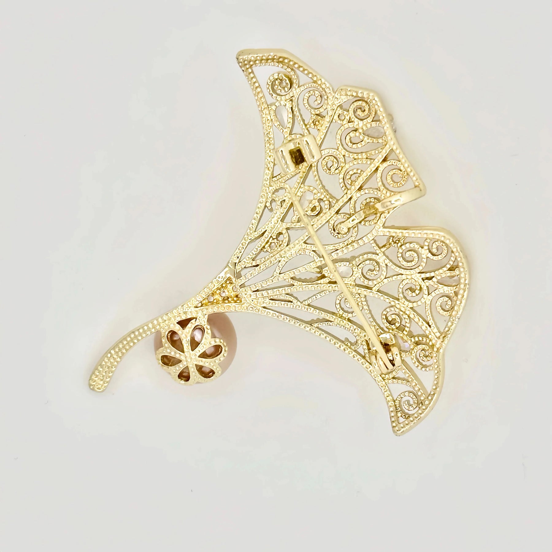 Available in two variations — soft pink and classic white freshwater pearls — each brooch features a finely sculpted gold-plated ginkgo leaf, intricately adorned with sparkling zircon crystals that capture light with every movement.