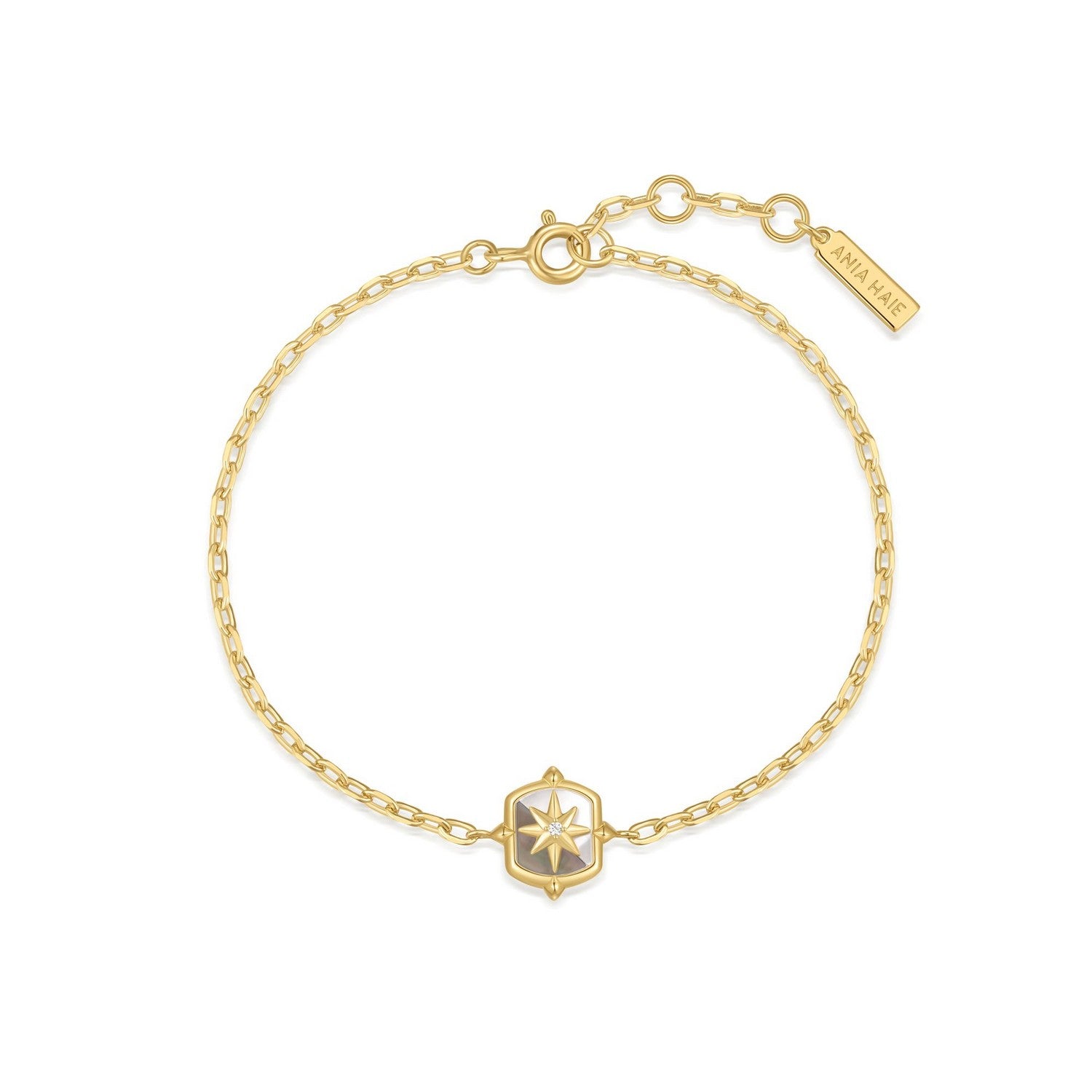 Embrace the latest dark aesthetic trend with this edgy bracelet. Featuring an eight-pointed star set on a mother-of-pearl base, it adds a bold and unique touch. Stack it with other pieces to create a look that's uniquely yours and sets the fashion pace.
