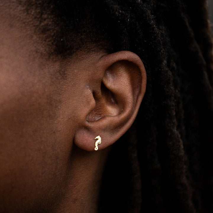 A superb accessory for beachgoers, mermaids, & swimmers! These gold seahorse stud earrings are a symbol of strength & powerMaterial - 18ct Gold Plated / Sterling Silver