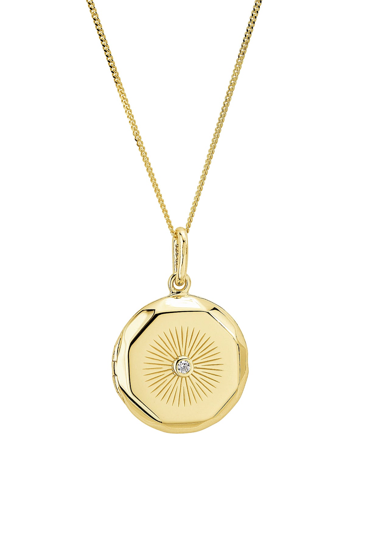 Brought to life by exquisite intricate details, this contemporary pendant is a fresh take on your classic locket. Accented with a divine Cubic Zirconia in the centre and adorned with faceted edges, the styling is both feminine and current. Crafted in gold plated Sterling Silver and partnered with a Sterling Silver gold plated curb chain, length 18 inches. Presented in a lovely gift box.