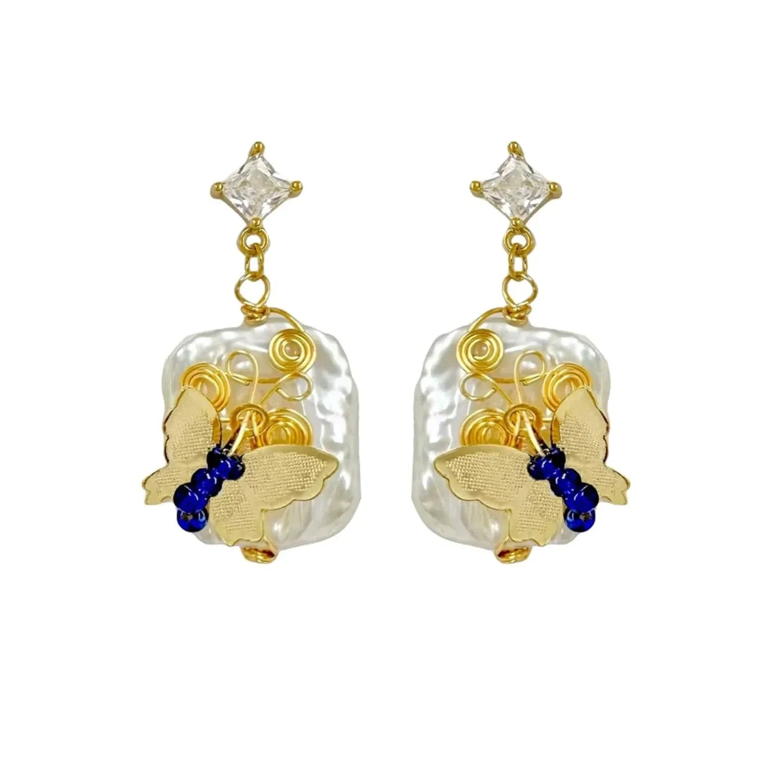 These Gold vermeil Baroque pearl drop earrings have been decorated with a delicate gold vermeil butterfly, making them perfect for any special occasion. The unique pearls are sure to draw attention, while the gold vermeil adds a subtle sparkle. These earrings are the ideal way to make a stunning statement.