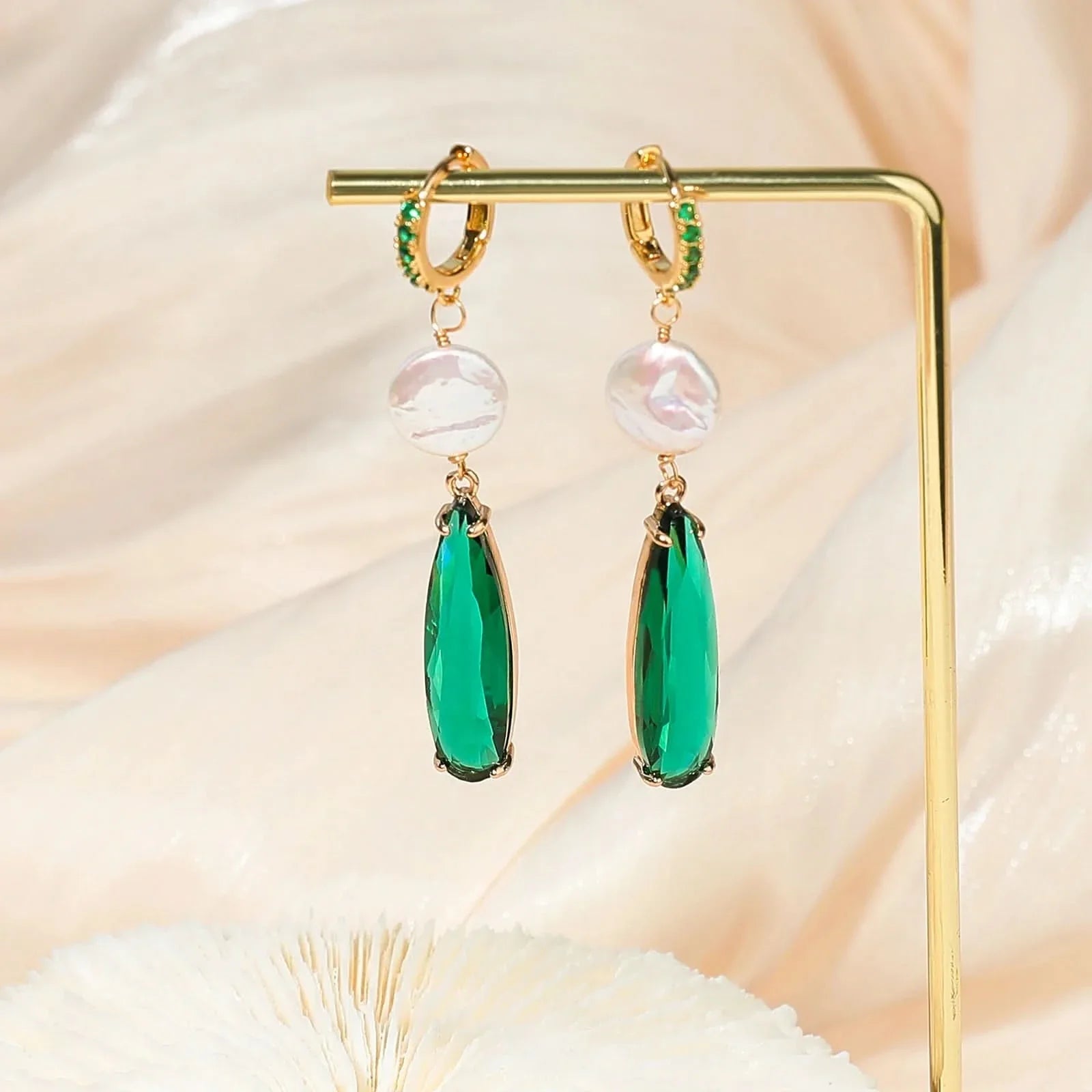 Each earring features a luminous baroque freshwater pearl, chosen for its unique natural shape and iridescent sheen, creating a beautiful contrast with the bold, faceted green crystal drop. The result is a harmonious balance of organic charm and refined luxury.