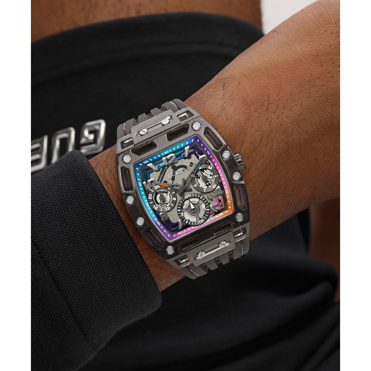 Inside, the transparent black multifunction dial adds layered dimension with exposed components and floating indexes. A vivid gradient frame surrounds the dial in electric shades of blue, purple, orange and pink, giving the watch a bold hit of color that intensifies its modern attitude.
