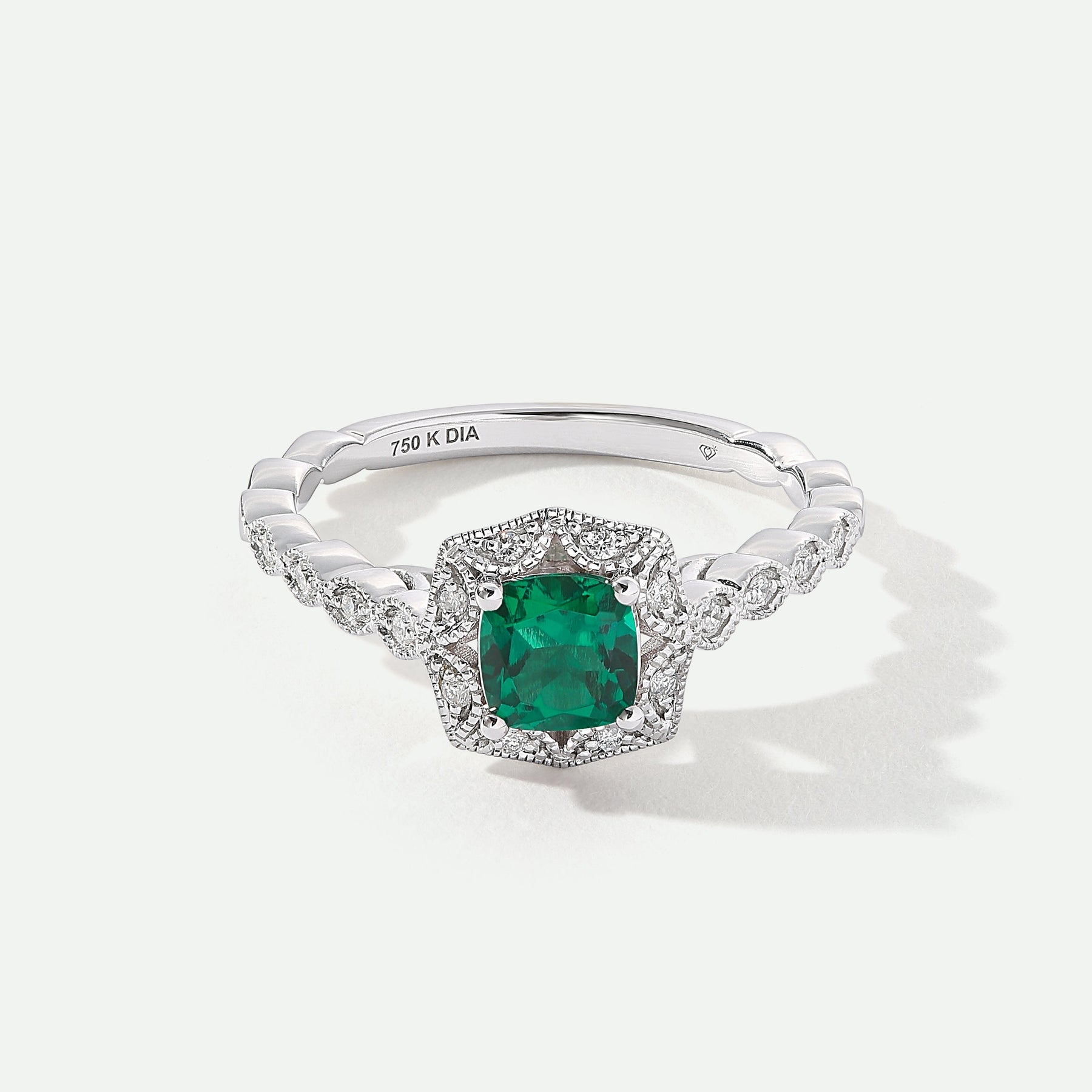 Harlow | 18ct White Gold 0.08ct tw Lab Grown Diamond and Created Emerald Vintage Ring
