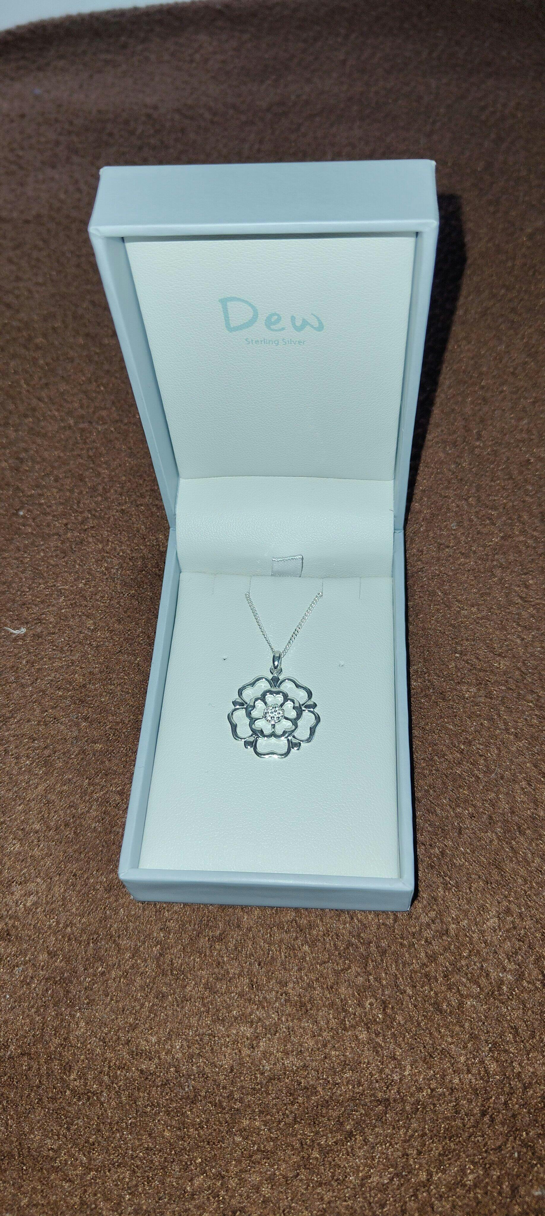 Intricate silver weaves to create this open Tudor Rose sterling silver necklace, hanging from an adjustable length of 16 to 18" The Tudor Rose is the traditional floral heraldic emblem of England and takes its name and origins from the Tudor dynasty.
