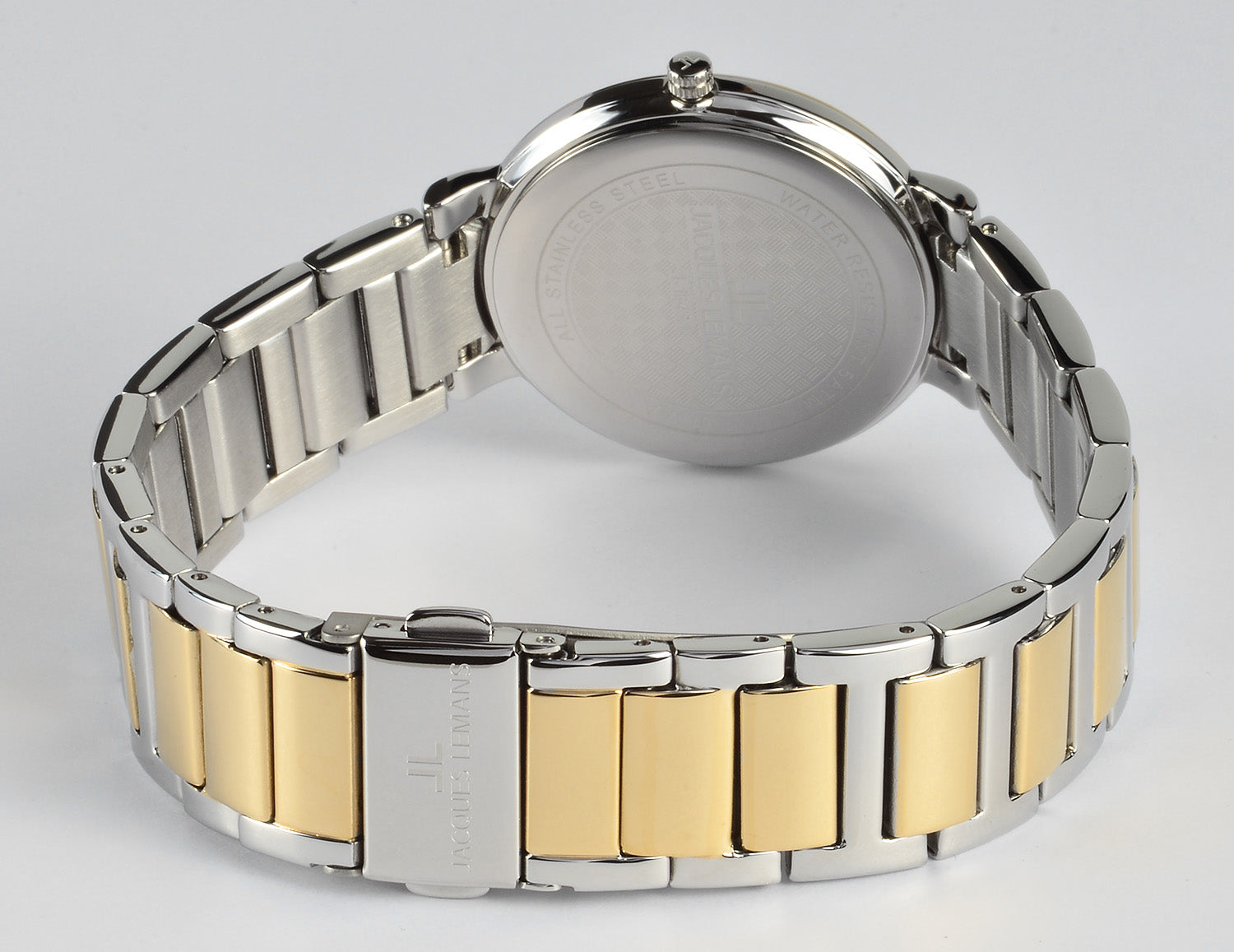 This ladies model from the Jacques Lemans Milano series is simply beautiful. The 32mm case, made of solid stainless steel/Ip-gold bicolor is adorned with sparkling crystals. The classy white dial has slim indexes. This watch has got a quartz movement, hardened crystex crystal, a round caseback and is water resistant up to 5 ATM. The bracelet is made of solid stainless steel/IP-gold bicolor with folding clasp with pusher, it adds the perfect finish to this model and turns it into a pretty timepiece for any occasion.