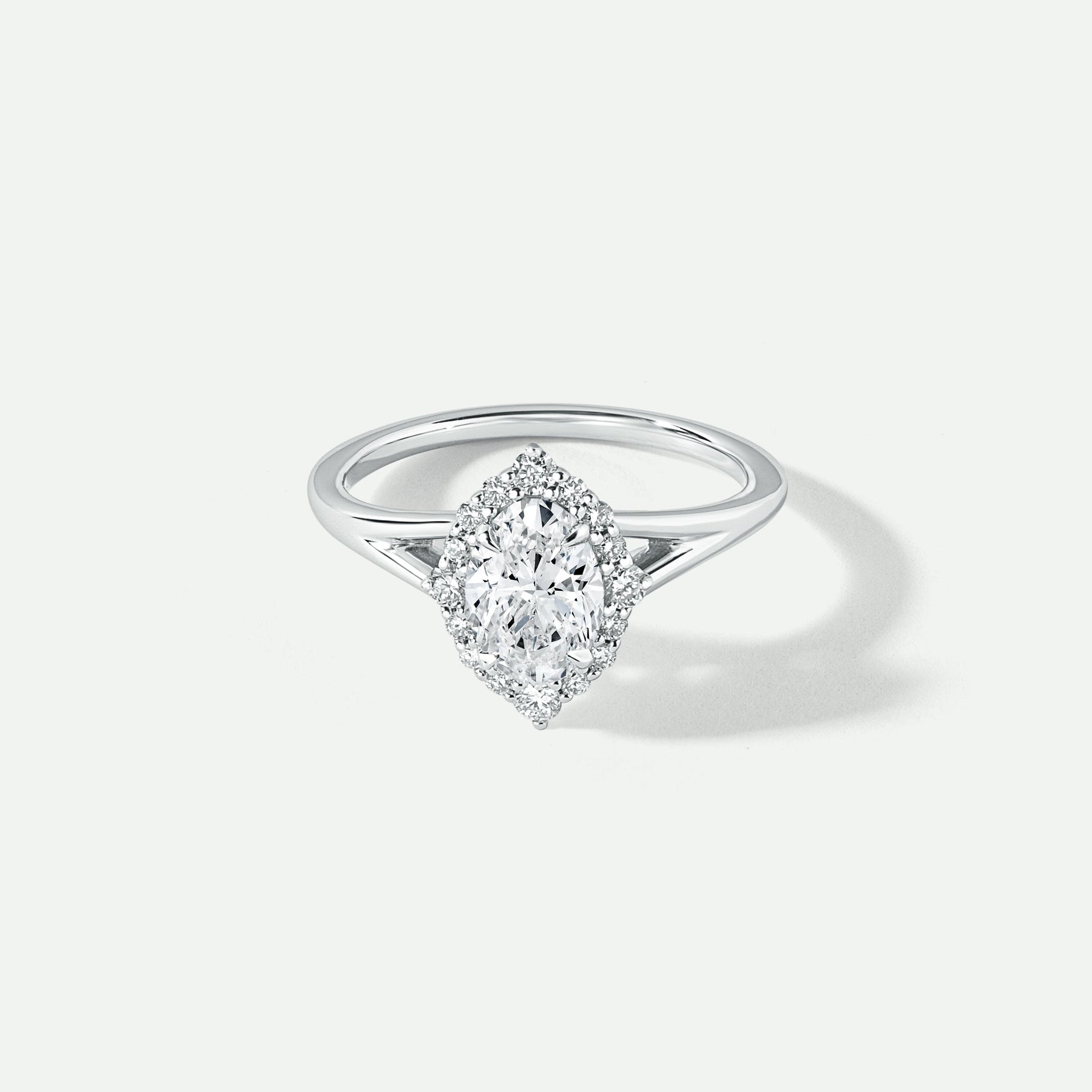 Introducing our Mischa Engagement Ring – a captivating blend of vintage allure and modern elegance. Crafted in 9ct solid white gold and adorned with a total of 1 carat of ethically sourced lab-grown diamonds. At its center shines a captivating oval-shaped lab-grown diamond, weighing 0.75 carats, surrounded by a mesmerizing marquise-shaped halo. The ring features a plain split shank, adding a modern twist to its vintage-inspired design.