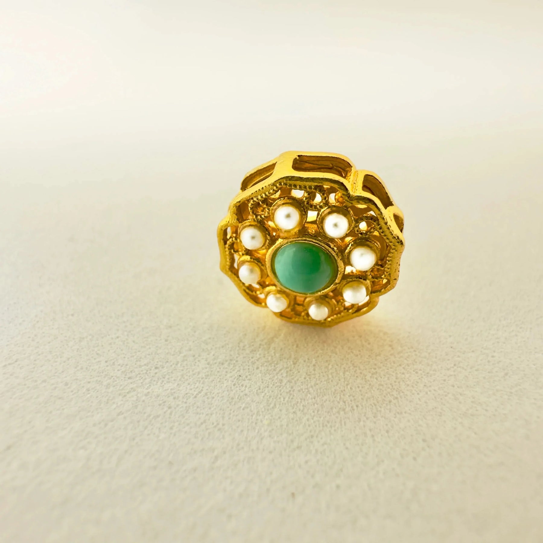 The turquoise stone symbolises protection and calm, while the pearls bring a sense of purity and light, harmonised in a golden frame that feels both vintage and timeless.