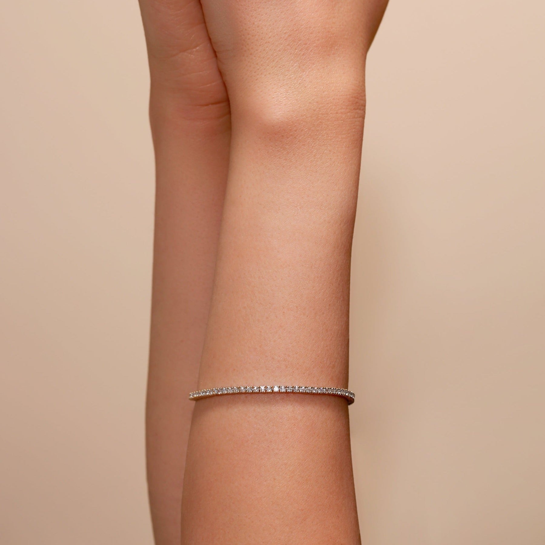 Our Penelope bracelet is exquisitely crafted in 9 carat yellow gold in a classic tennis design. Set with 3 carats of brilliant lab grown diamonds, this luxurious piece drapes elegantly across the wrist and is secured with a two catch clasp. The Penelope bracelet has a total length of 7.25 inches.