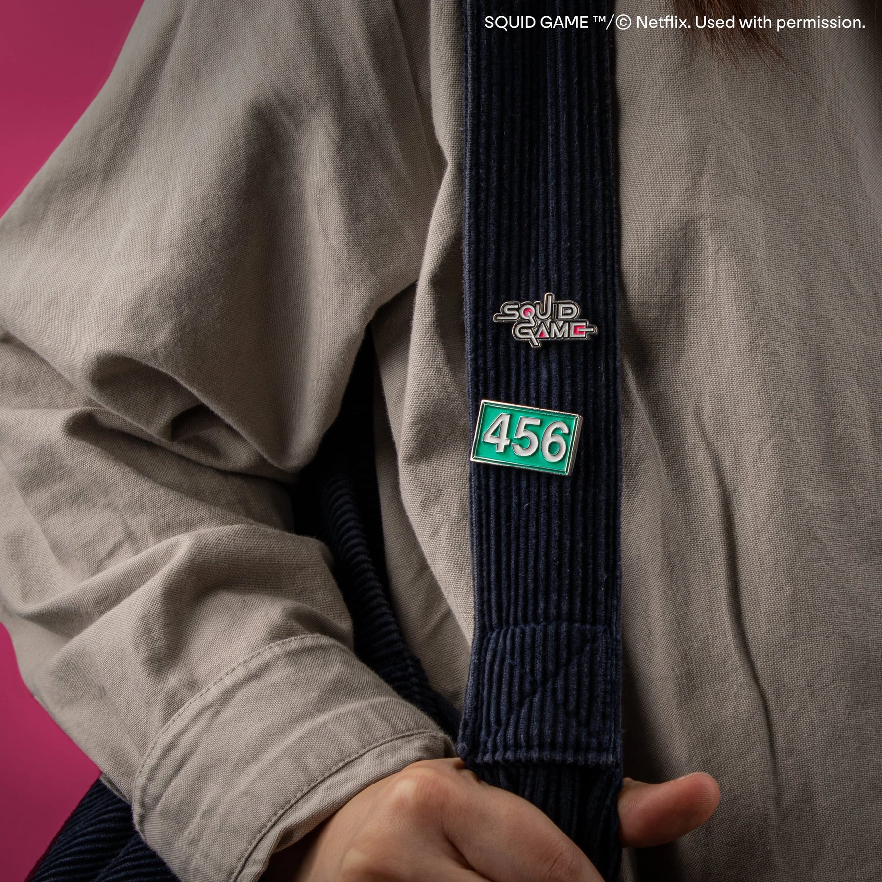 Delve into a realm of intrigue with a duo of striking pins featuring Player 456 and the recognizable Squid Game logo. Each pin is a reminder of the adventure played by the 456 players, and especially the main character Seong Gi-hun, also known as Player 456.