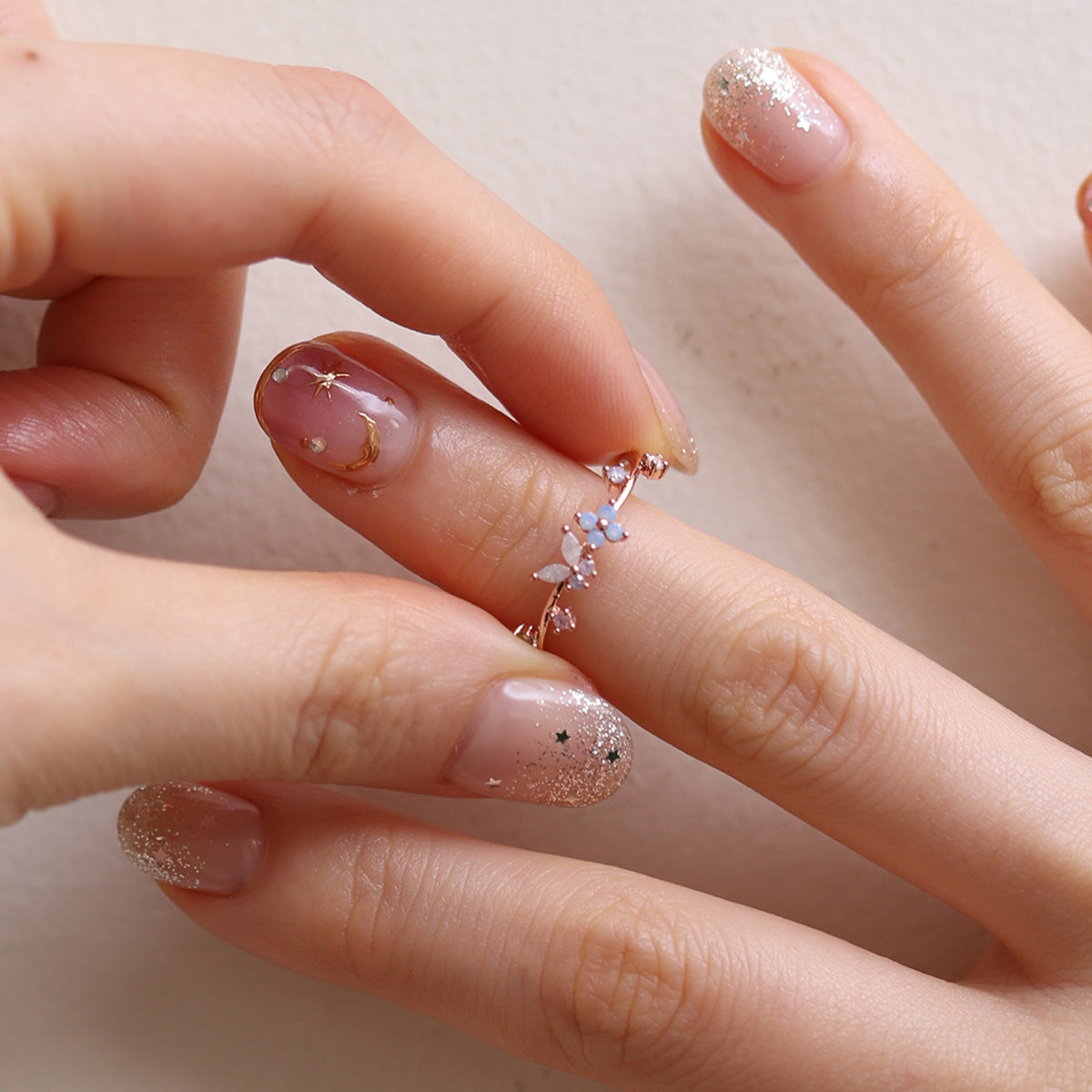 No detail is overlooked – from the graceful flow of the band to the harmonious pastel tones. Available in gold, silver, or rose gold plating, and in UK sizes K, M, O, Q, it’s perfect for stacking or wearing alone as a soft, romantic statement.