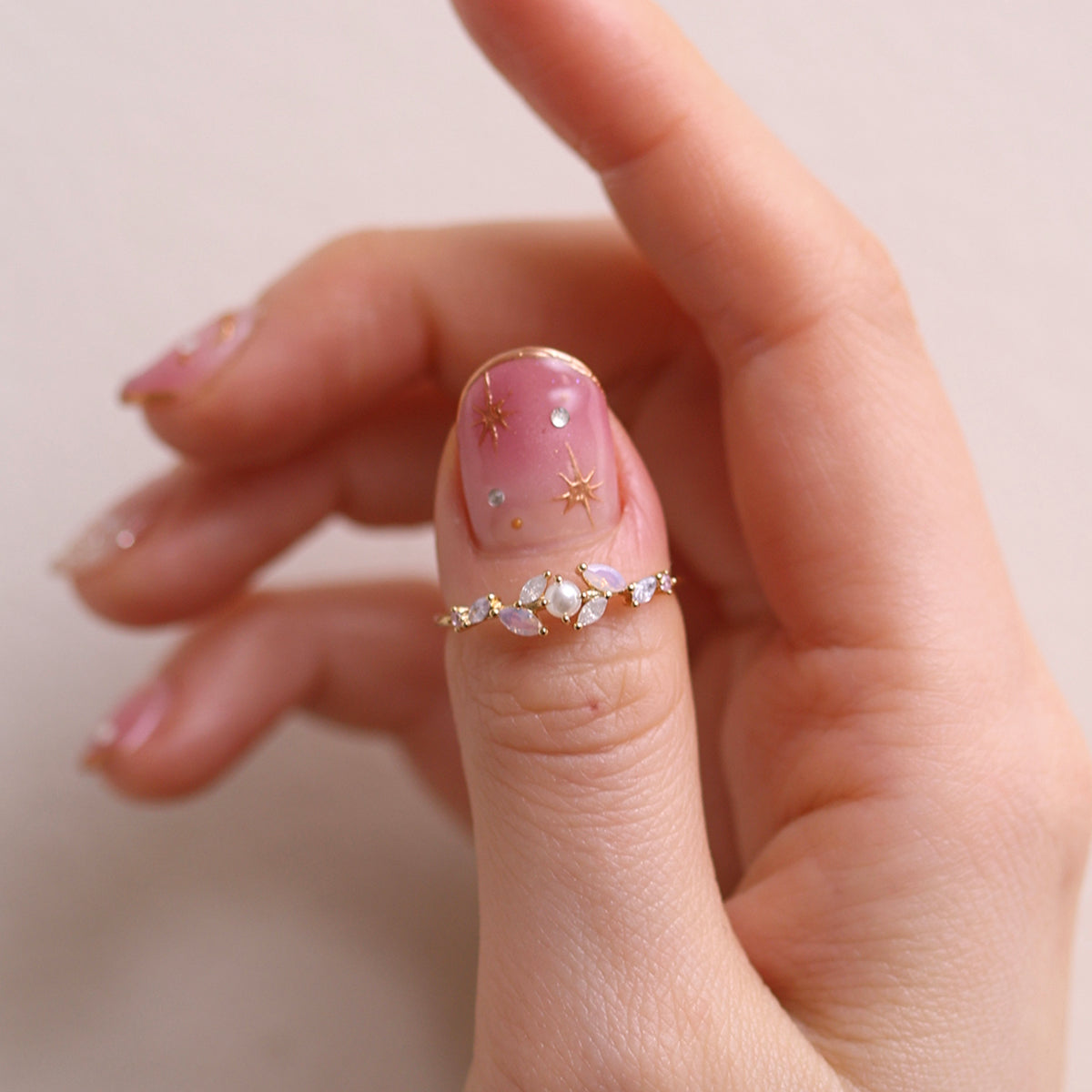 Elegant and ethereal, our Pearl & Moonstone Leaf Ring is one of our all-time bestsellers – and for good reason. A luminous pearl sits at the centre, beautifully framed by soft iridescent moonstone leaves in marquise and round cuts. The result is a delicate floral-inspired design that feels both romantic and modern.