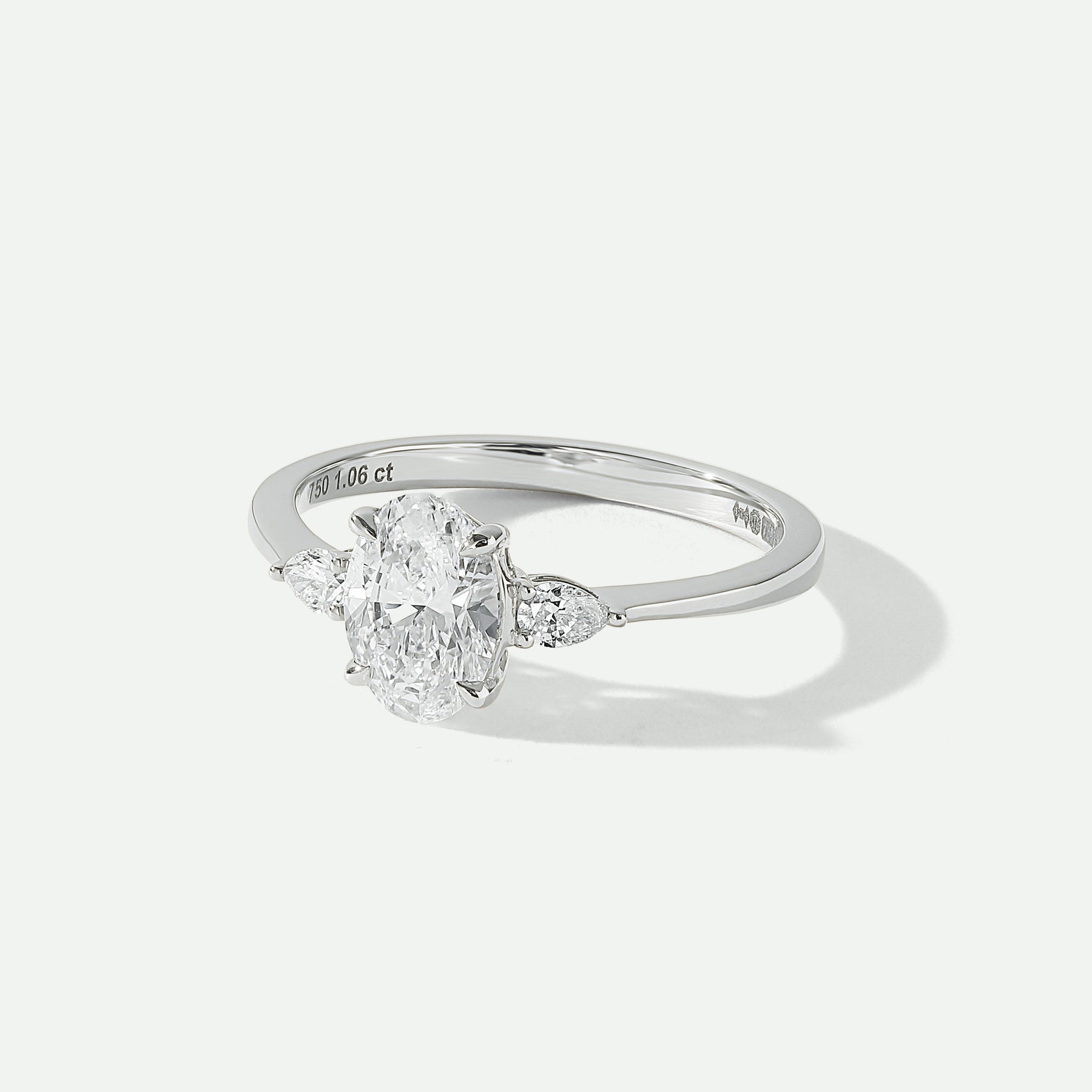 Our Rebecca ring is set with a beautiful oval shape lab grown diamond. The oval centre stone is cradled by lustrous claw prongs and set between two stunning pear shape diamonds for added sparkle. Crafted in 18-carat white gold, the Rebecca ring has a approximate total lab grown diamond weight of 1.06ct. The 1ct oval centre stone is IGI certificated and comes with a full diamond certificate.