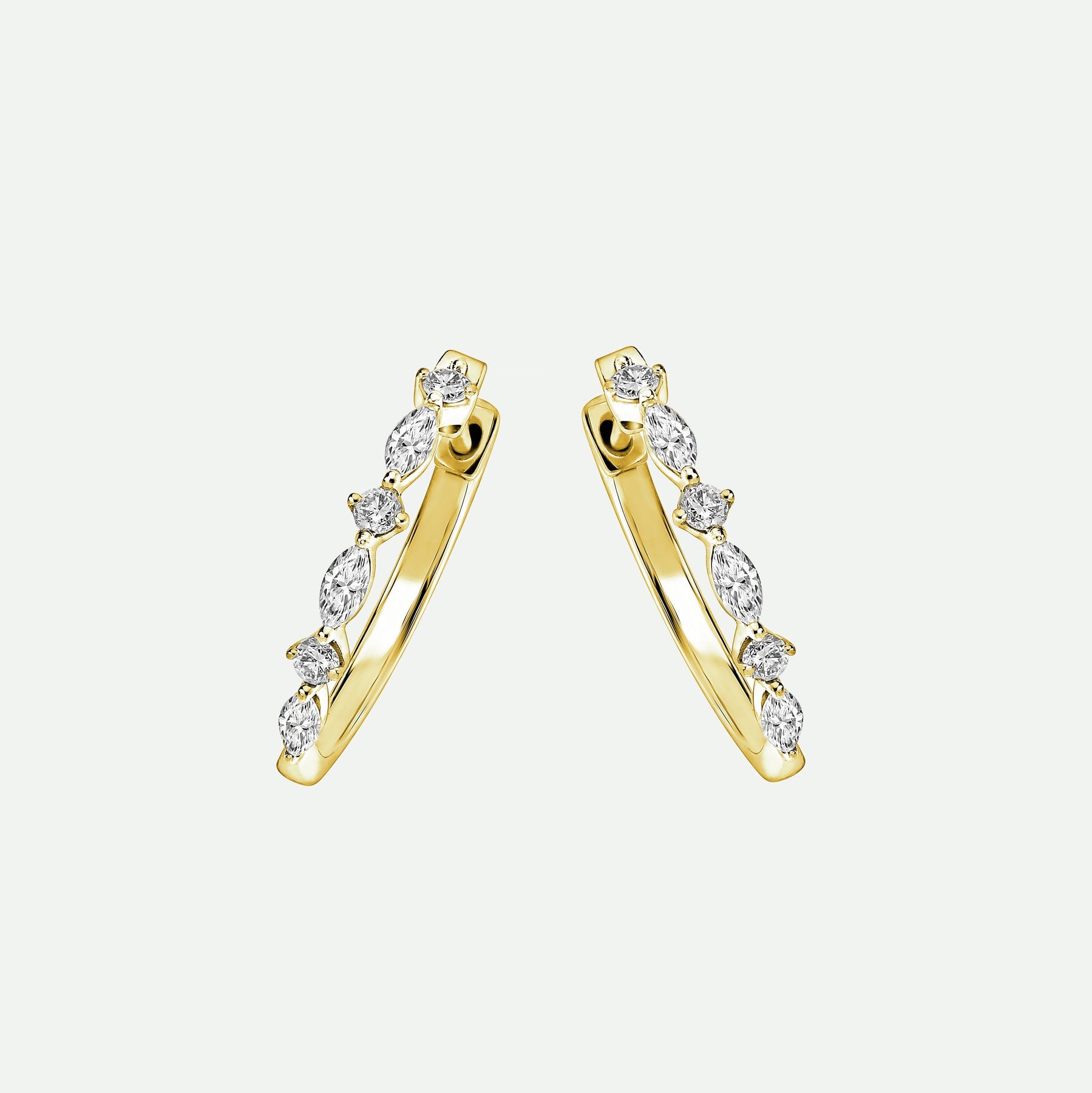 Our Rose earrings feature bright marquise-cut and round shaped lab grown diamonds, maximising their sparkle. Set in 9 carat yellow gold they have a total carat weight of 0.60ct. These diamond and gold hoop earrings can be worn for special occasions like weddings and festive events, yet are subtle and stylish enough for everyday wear.