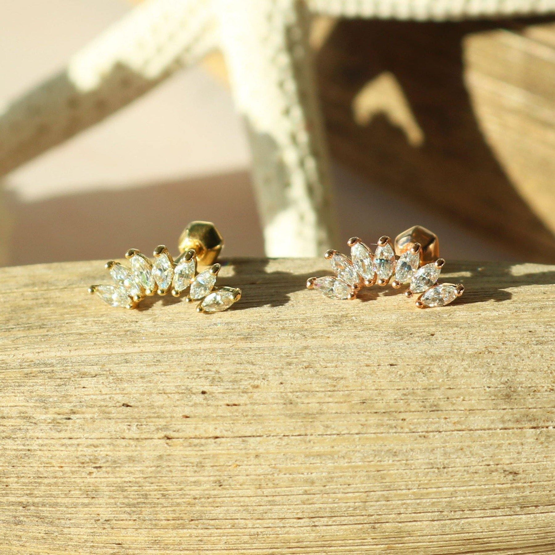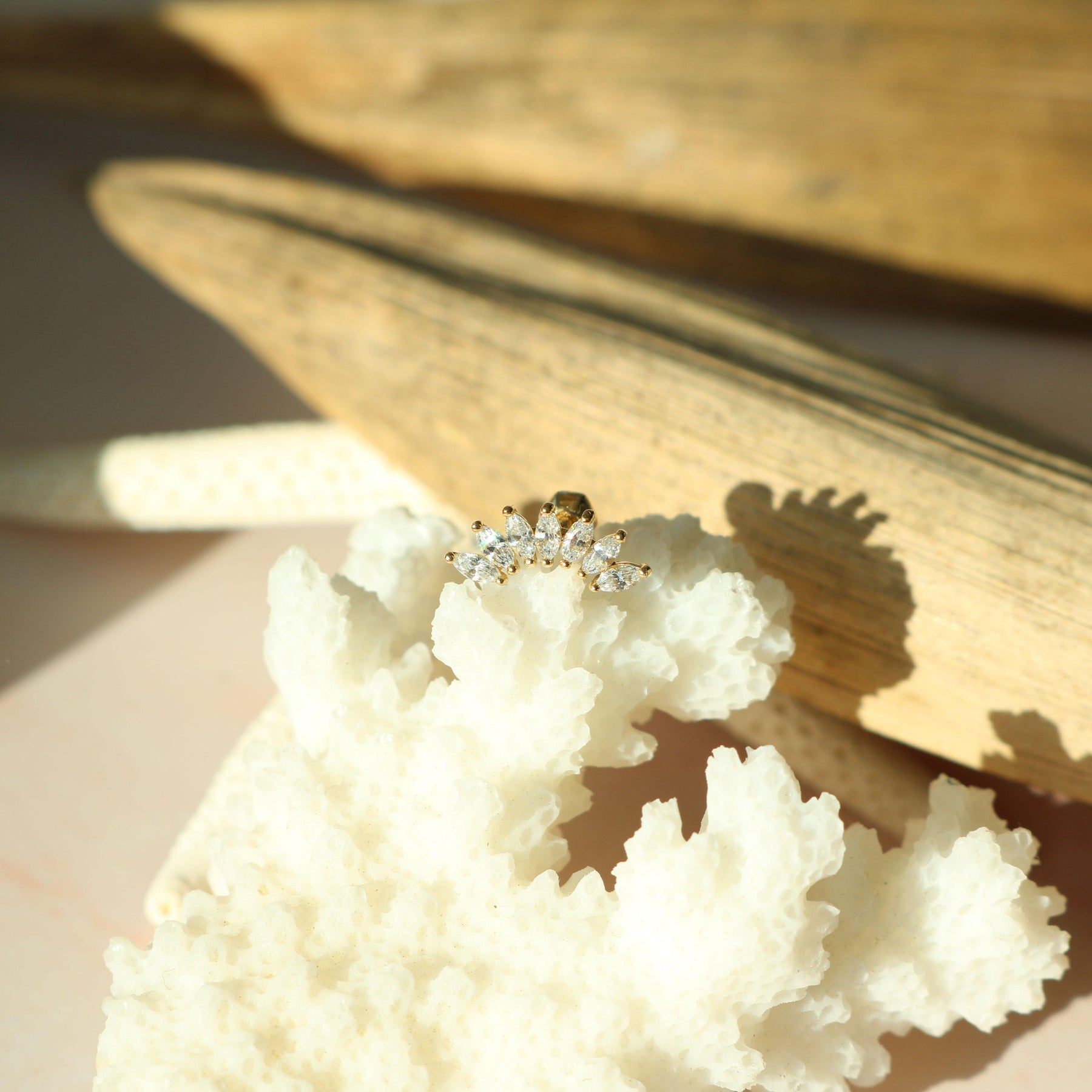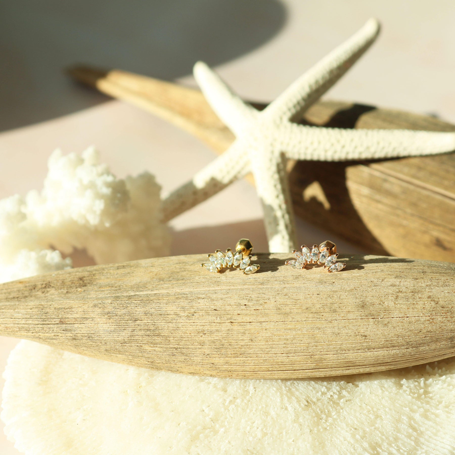 This 14k gold and rose gold Crystal barbel is a stunner. Elegantly designed with a slight curve which gives referene to the beautiful peacock. Also available in a rainbow colour for that added oomf to seduce all who stare.