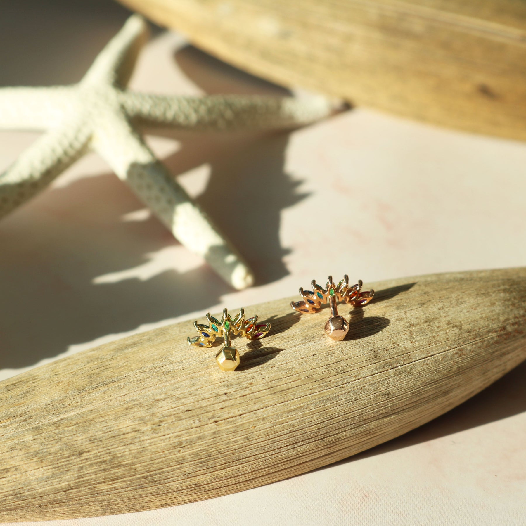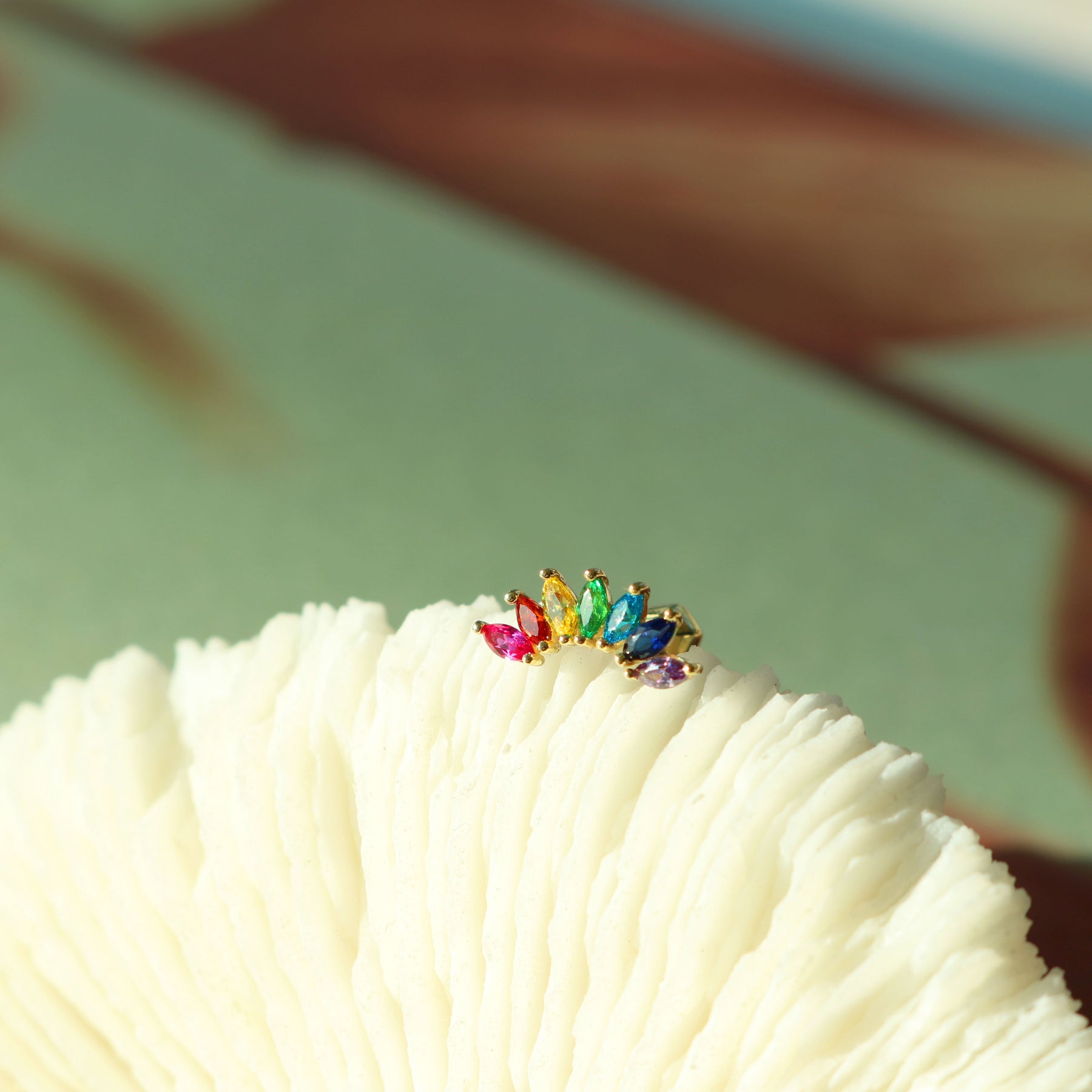 This 14k gold and rose gold Crystal barbel is a stunner. Elegantly designed with a slight curve which gives referene to the beautiful peacock. Also available in a white colour for that added oomf to seduce all who stare.