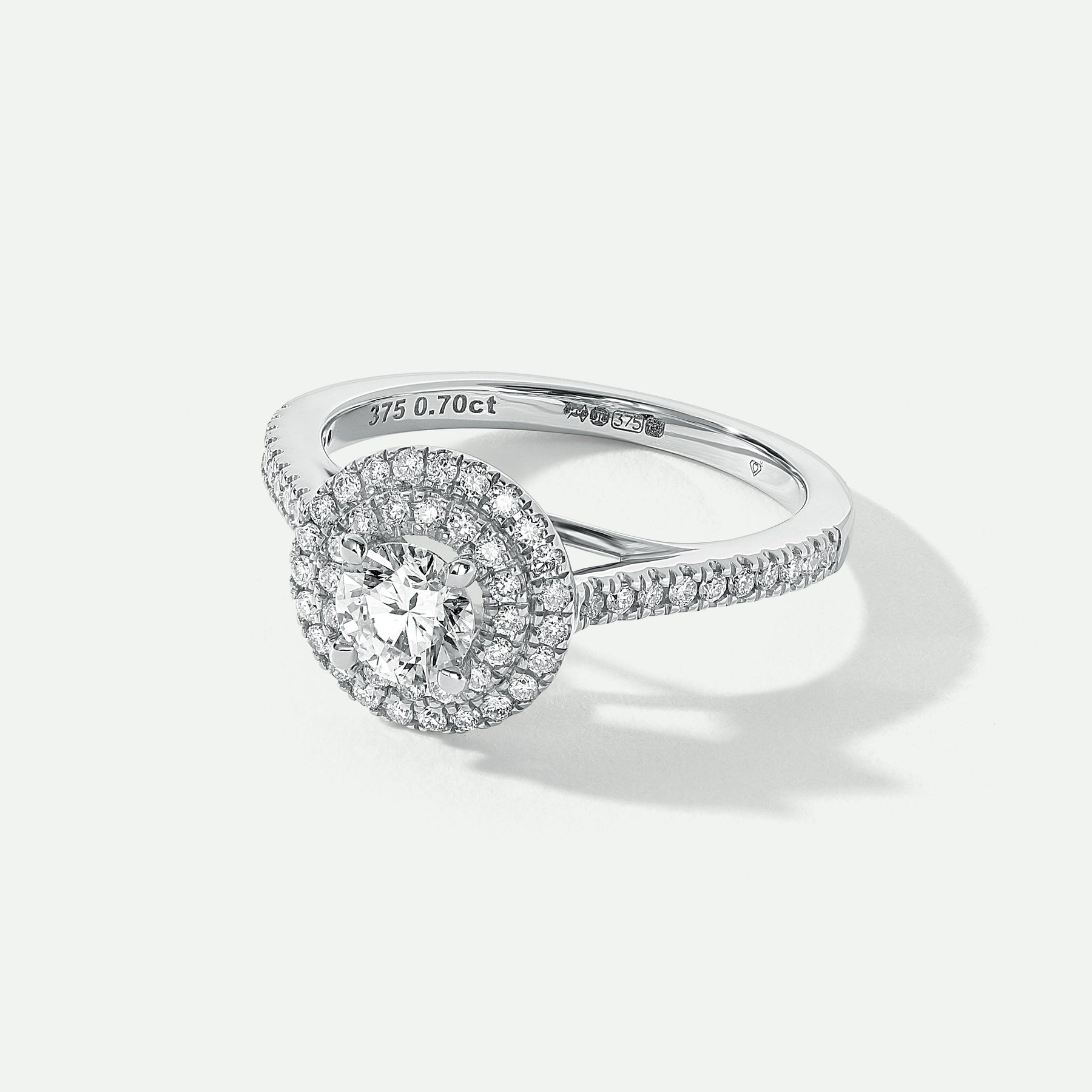 Framed by a double halo of pavé set diamonds, this luxurious engagement ring has a total diamond weight of 0.70ct. Embellished with diamond set shoulders for even more sparkle, the Sienna ring is a wonderful way to express your love.