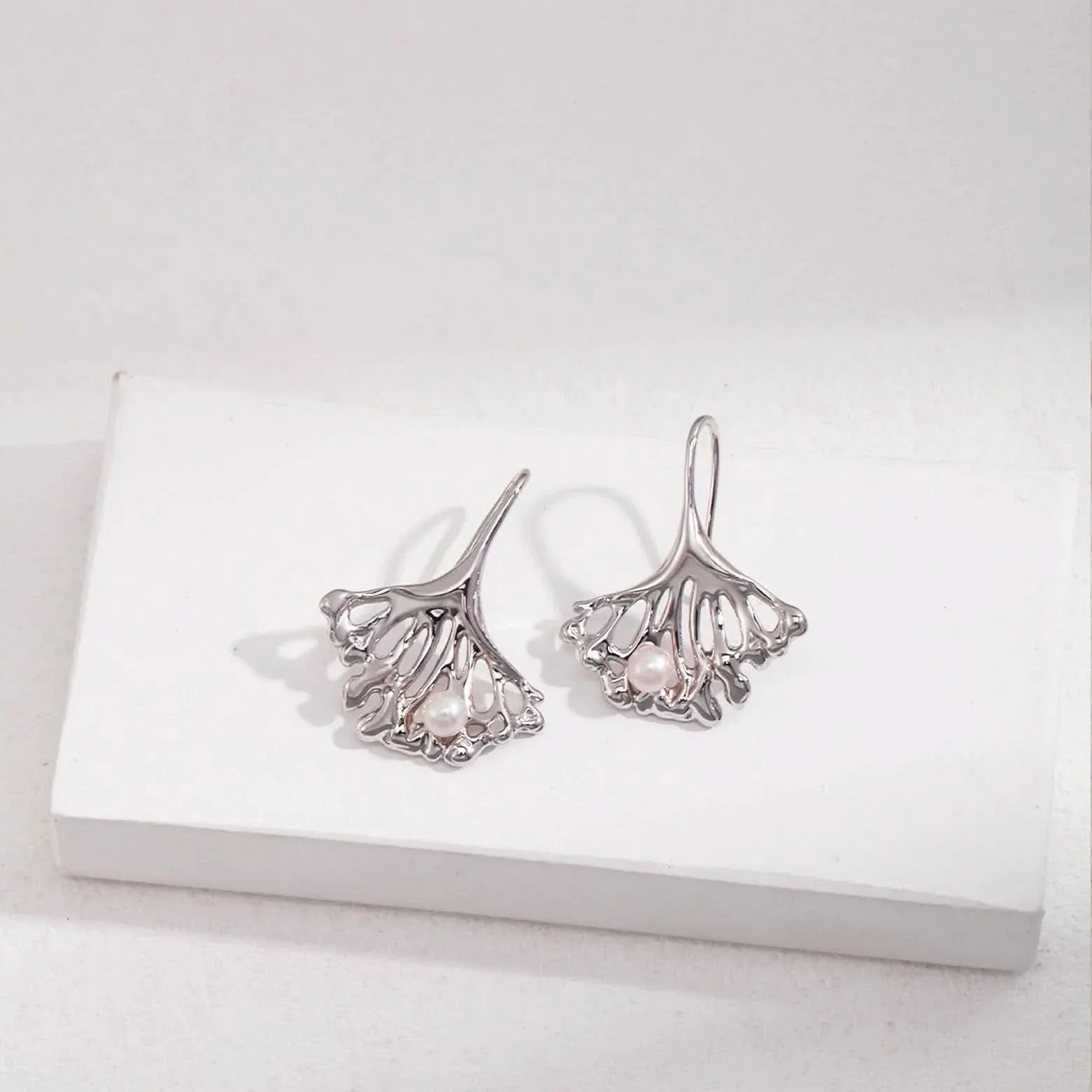 These Ginkgo Leaf Pearl Earrings are the perfect accessory for any occasion! Crafted from sterling silver, each earring features a delicate ginkgo leaf design with a single freshwater pearl suspended from it. These earrings are sure to add a beautiful and elegant touch to your look.