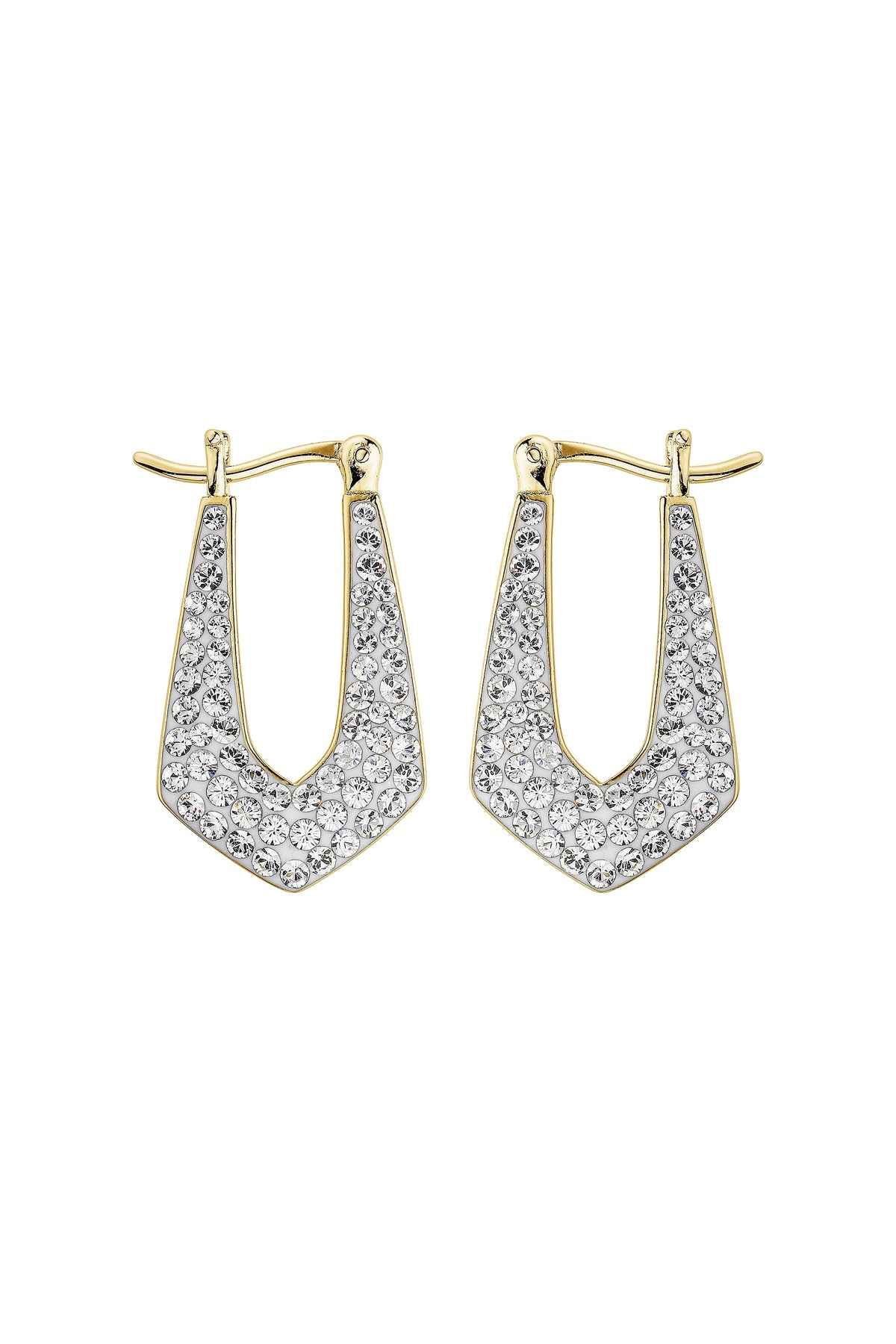 A stylish pair of geometric hoop earrings perfect for everyday wear. The edgy design is set with a display of crystals creating the perfect sparkle. Crafted in gold plated Sterling Silver with a hinge closure. Presented in an Evoke gift box.